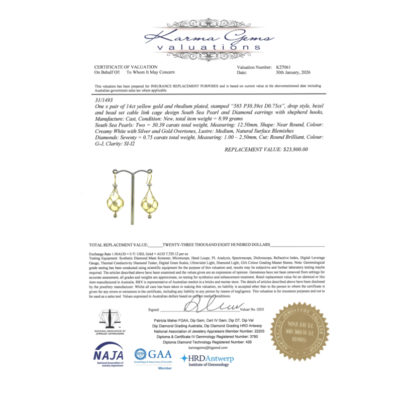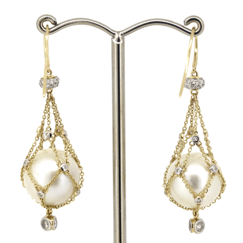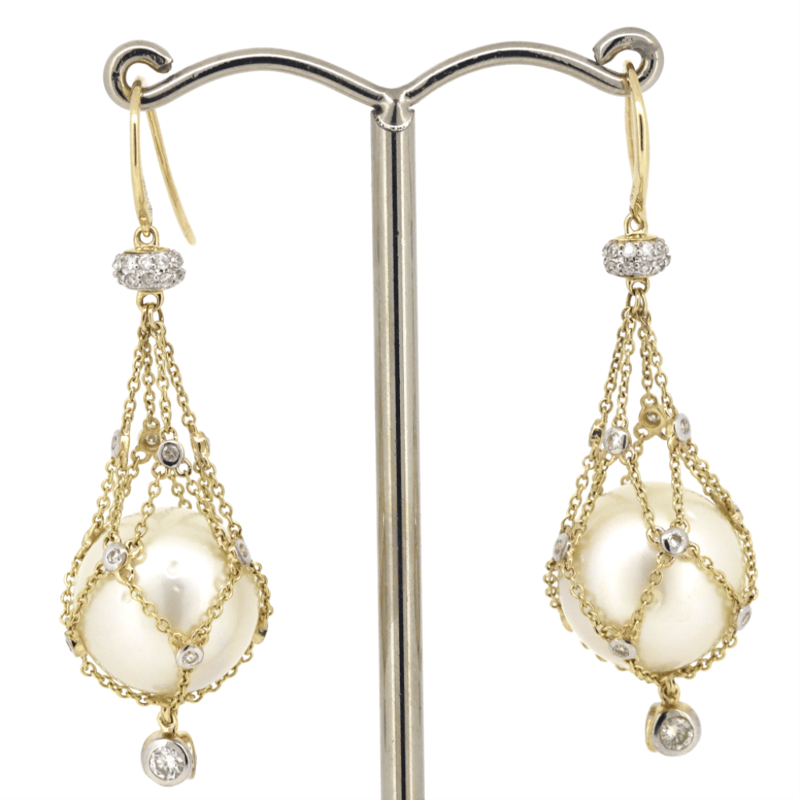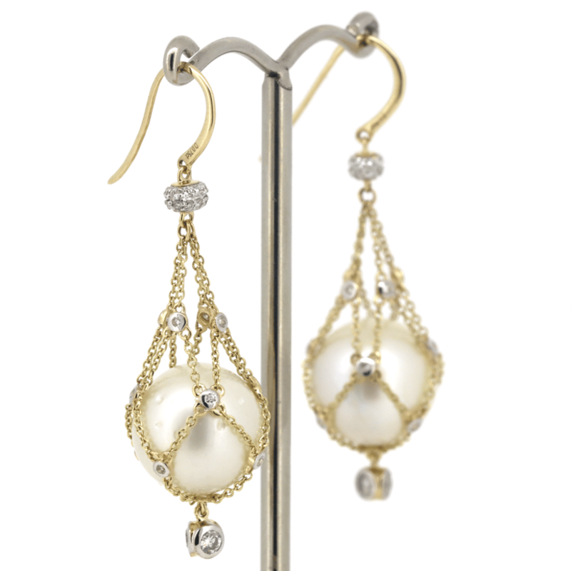 The Design Features, 2 Near Round Cream With Silver And Gold Overtones, Cultured South Sea Pearls (30.39Ct/12.50Mm Size, Medium Lustre, Natural Surface Blemishes), Cage Set. Decorating The Cage Settings Are, 70 Round Brilliant Cut, Diamonds (0.75Ct Tdw, G-J Colour, Si-I2 Clarity), Bead/Bezel Set. The Earrings Feature Shepherd Hooks.