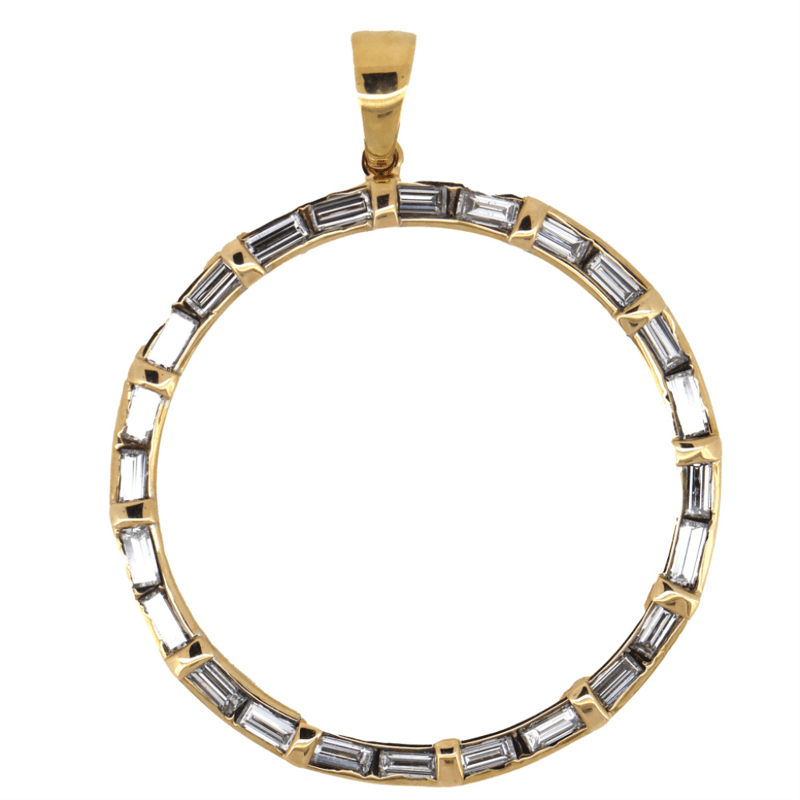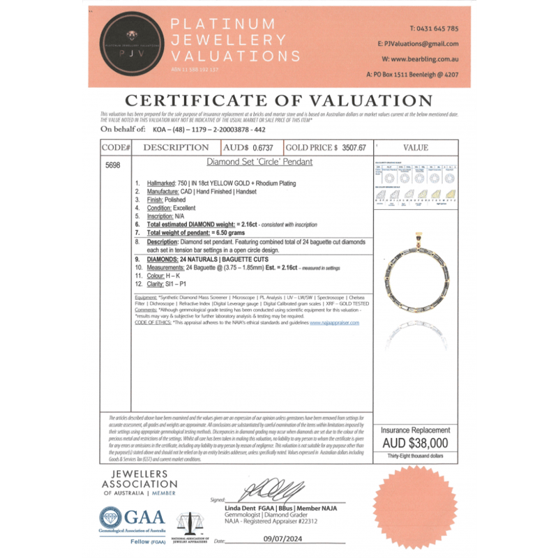18K YELLOW GOLD AND DIAMOND, HALO PENDANT. The Design Features, 24 Baguette Cut, Diamonds (2.16Ct Tdw, H-K Colour, Si1-P1 Clarity), Tension Set. Valuations Provided by an Independent Third-Party Professional Not Directly Associated With Lloyds Auctions at AUD $$38,000.00This valuation has been conducted by an independent third-party professional. The valuation amount is an assessment by the issuing valuer and does not reflect the auction value of the item. Any inquiries regarding the valuation should be directed to the issuing valuer (refer to contact details on the certificate), as Lloyds Auctions has no affiliation or influence over the valuation, the valuer, or the stated amount. Condition: Good - Refer Images 0645944+5230