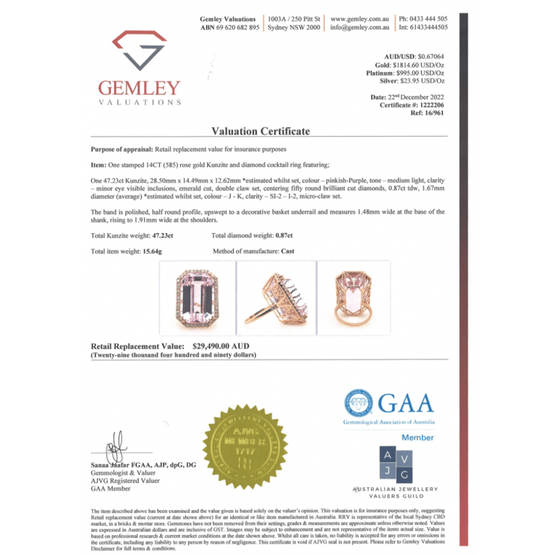 The Centre Features, One Emerald Cut, Medium Light Pinkish-Purple, Kunzite (47.23Ct, Minor Eye Visible Inclusions), Double 4 Claw Set. Surrounding The Centre In A Halo And Embellishing The Shoulders Are, 50 Round Brilliant Cut, Diamonds (0.87Ct Tdw, J-K Colour, Si2-I2 Clarity), Micro-Claw Set. Ring Size M 1/2.