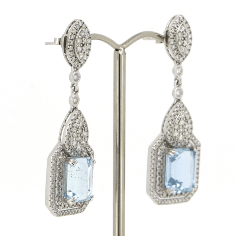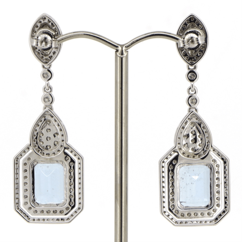 14K WHITE GOLD, AQUAMARINE AND DIAMOND, DECORATIVE DROP EARRINGS.