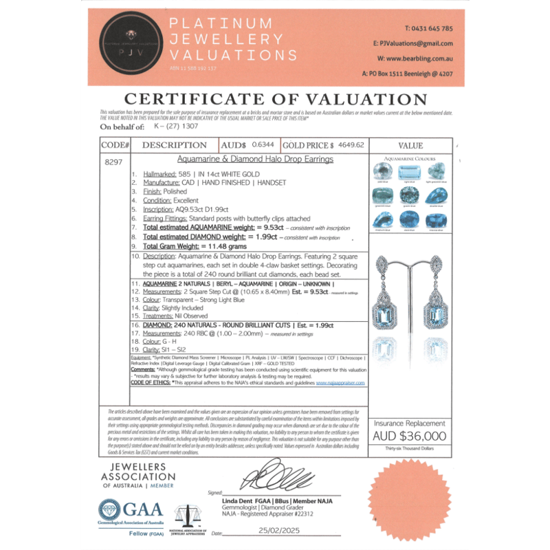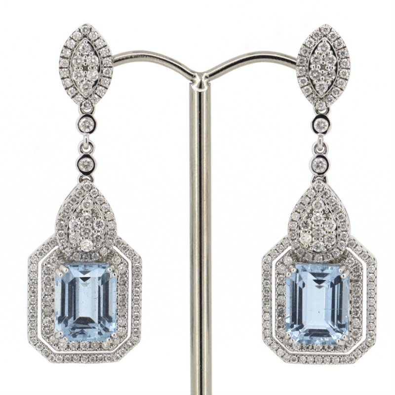 The Designs Feature, 2 Square Step Cut, Strong Light Blue, Aquamarines (9.53Ct Tsw, Slightly Included), Double 4 Claw Set. Decorating The Design Are, 240 Round Brilliant Cut, Diamonds (1.99Ct Tdw, G-H Colour, Si1-Si2 Clarity), Bead Set.
