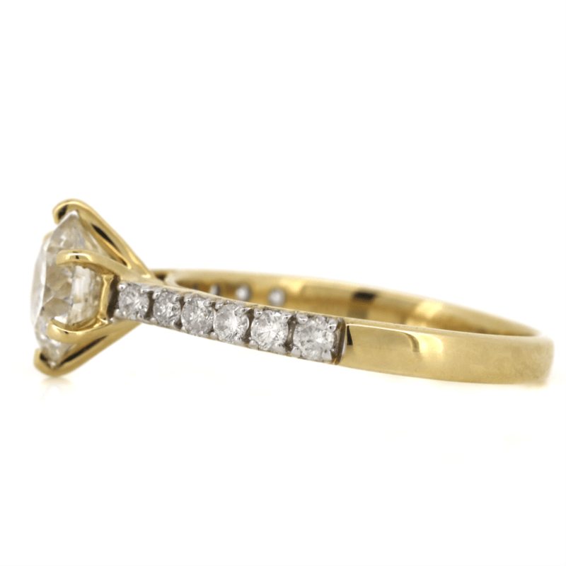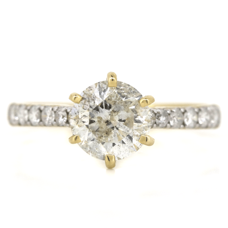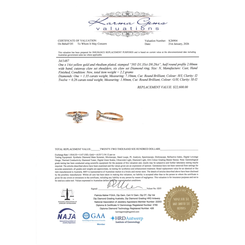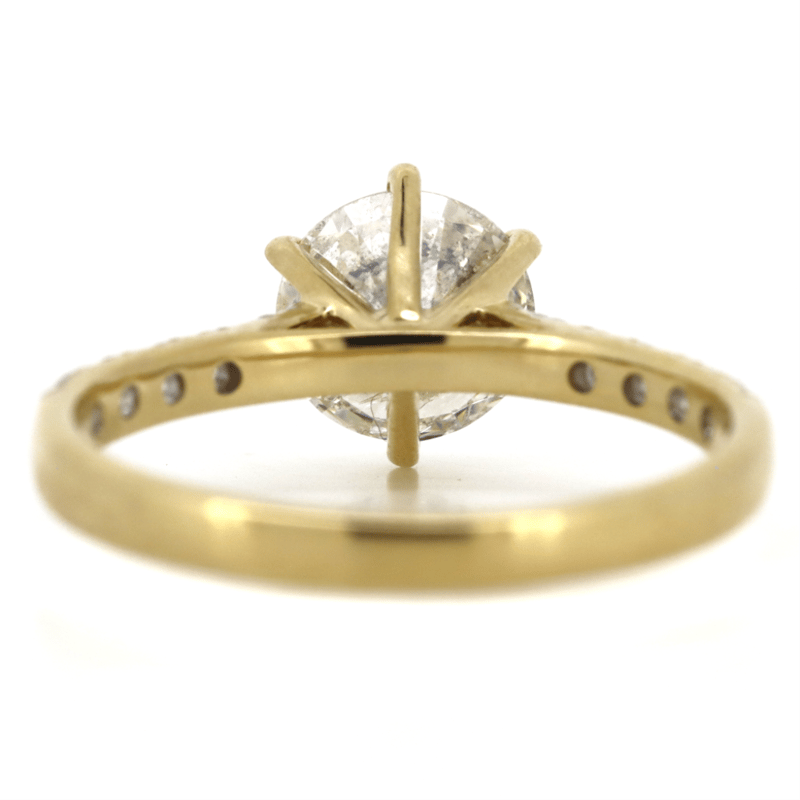 The Centre Features, One Round Brilliant Cut, Diamond (1.35Ct, H-I Colour, I2 Clarity), Claw Set. Decorating The Band Are, 12 Round Brilliant Cut, Diamonds (0.28Ct Tdw, G-H Colour, Si-I2 Clarity), Bead Set. Ring Size M 1/2.