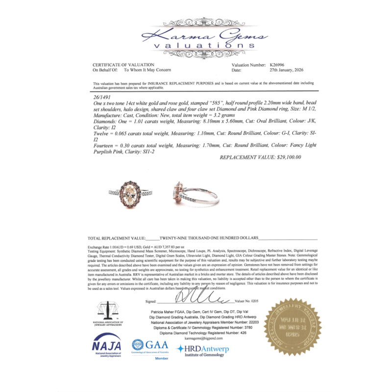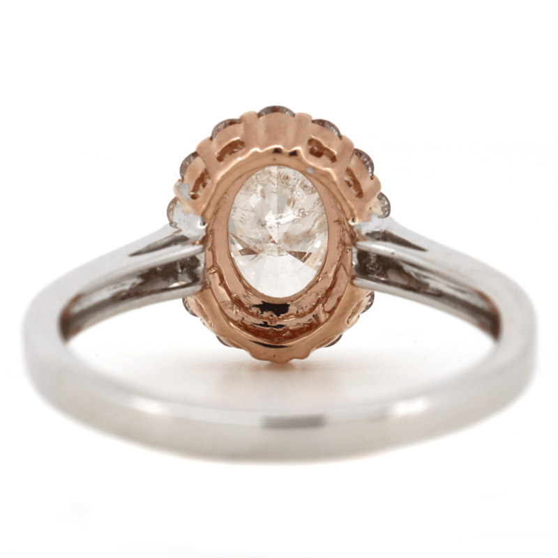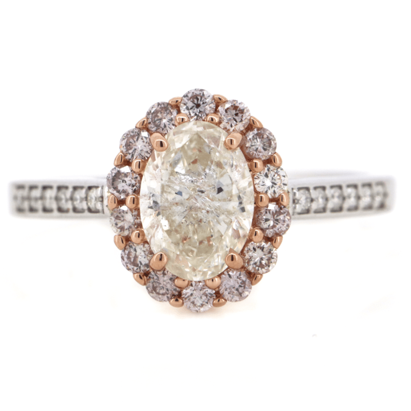 The Centre Features, One Oval Brilliant Cut, Diamond (1.01Ct, J-K Colour, I2 Clarity), 4 Claw Set. Encompassing The Centre Are, 14 Round Brilliant Cut, Fancy Pink Diamonds (0.30Ct Tdw, Si1-2 Clarity), Claw Set. Decorating The Band Are, 12 Round Brilliant Cut, Diamonds (0.065Ct Tdw, G-I Colour, Si-I2 Clarity), Bead Set. Ring Size M 1/2.