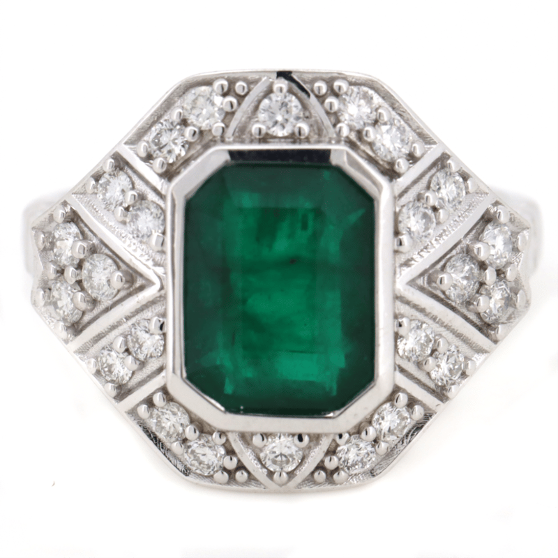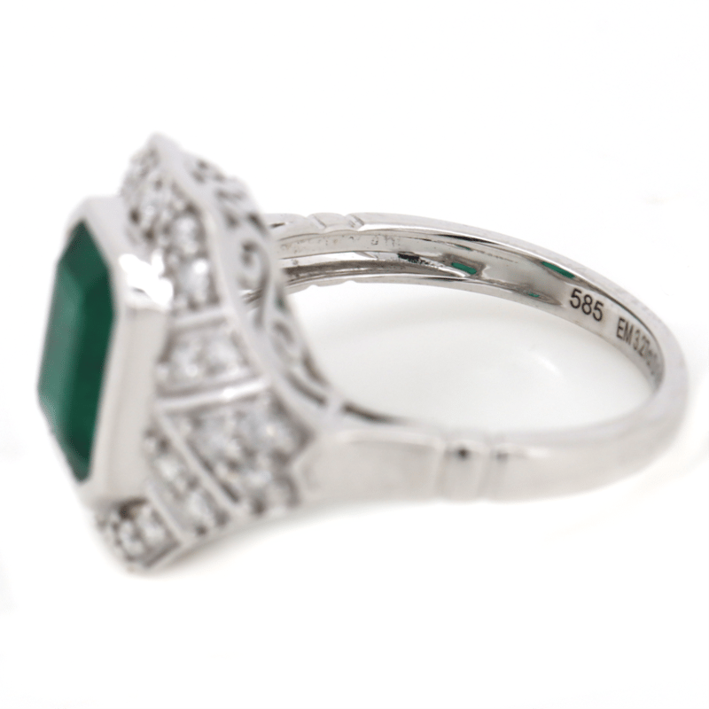 14K WHITE GOLD, EMERALD AND DIAMOND, ART DECO INSPIRED RING.