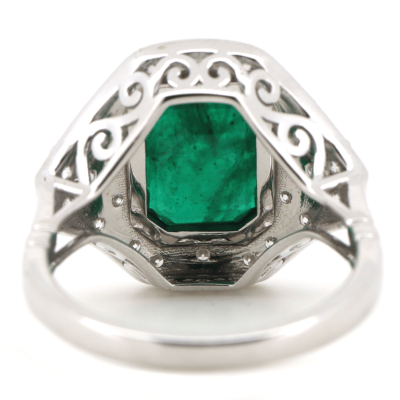 The Centre Features, One Emerald Cut, Emerald (3.27Ct, Surface Reaching Inclusions), Bezel Set. Encompassing The Centre Are, 24 Round Brilliant Cut, Diamonds (0.52Ct Tdw, G-J Colour, Si1-2 Clarity), Bead Set. Ring Size O.