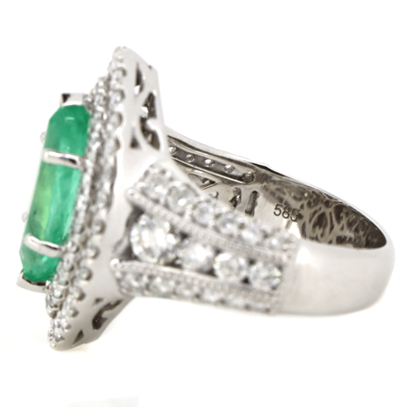 14K WHITE GOLD, 3.02CT COLOMBIAN EMERALD AND DIAMOND, DOUBLE HALO RING.