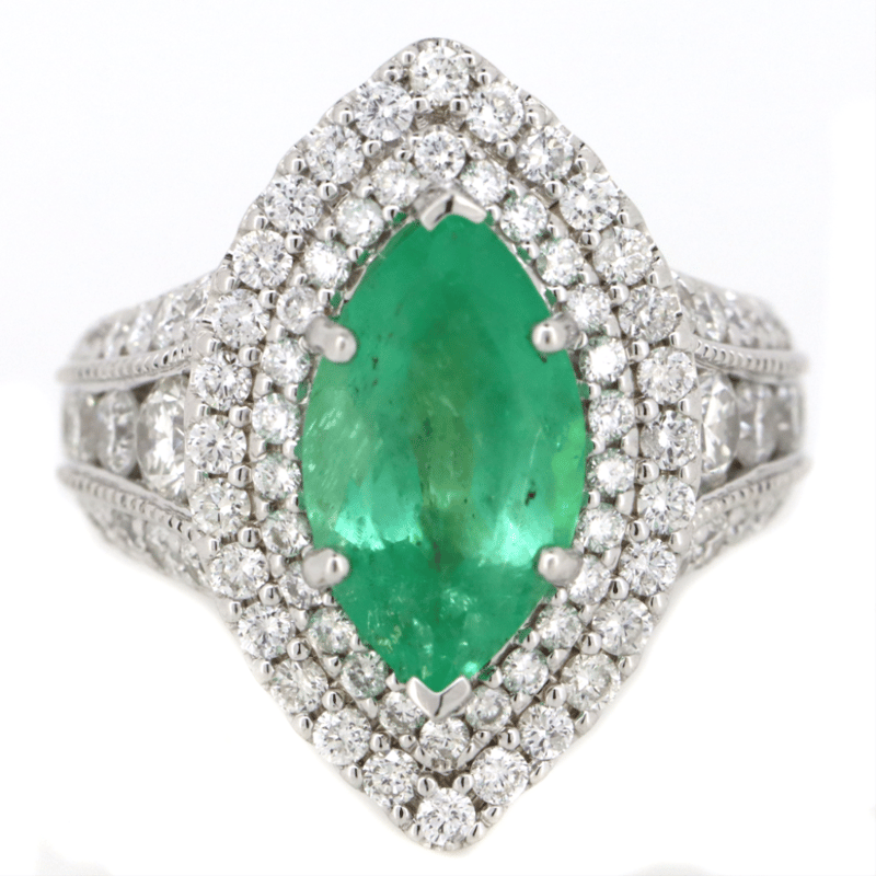 The Centre Features, One Marquise Cut, Colombian Emerald (3.02Ct, Moderately Included), Bezel Set. Encompassing The Design Are, 86 Round Brilliant Cut, Diamonds (1.80Ct Tdw, G-H Colour, Si1-Si2 Clarity), Pip Claw/Bead Set. Ring Size M 1/2.