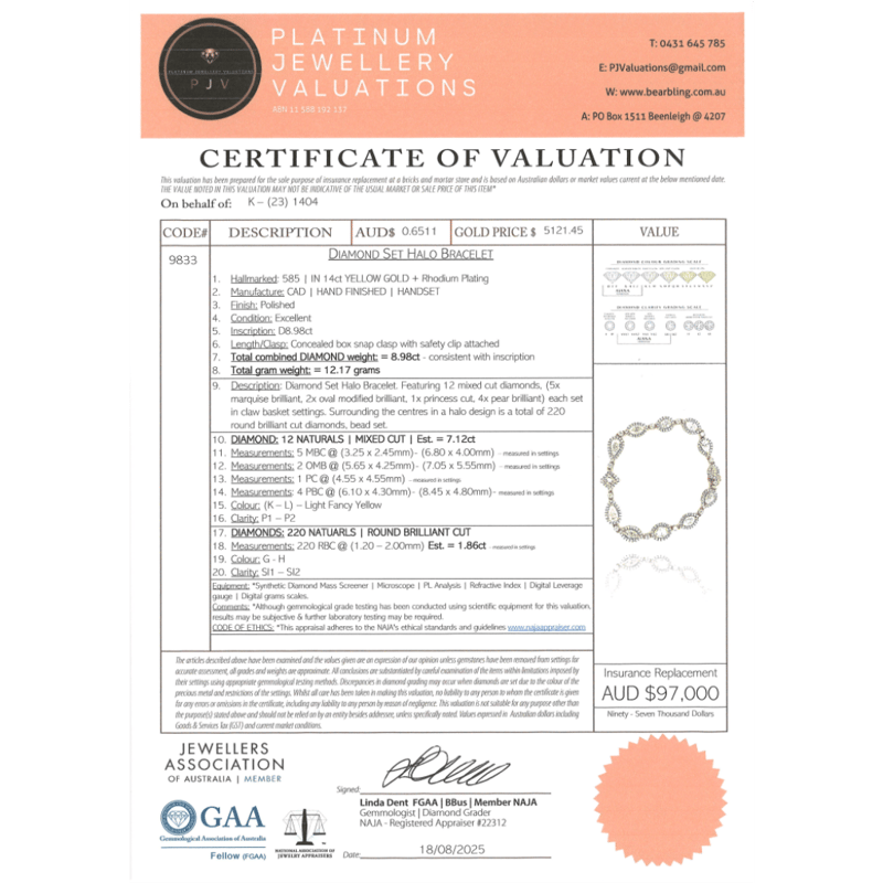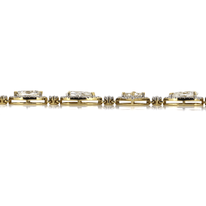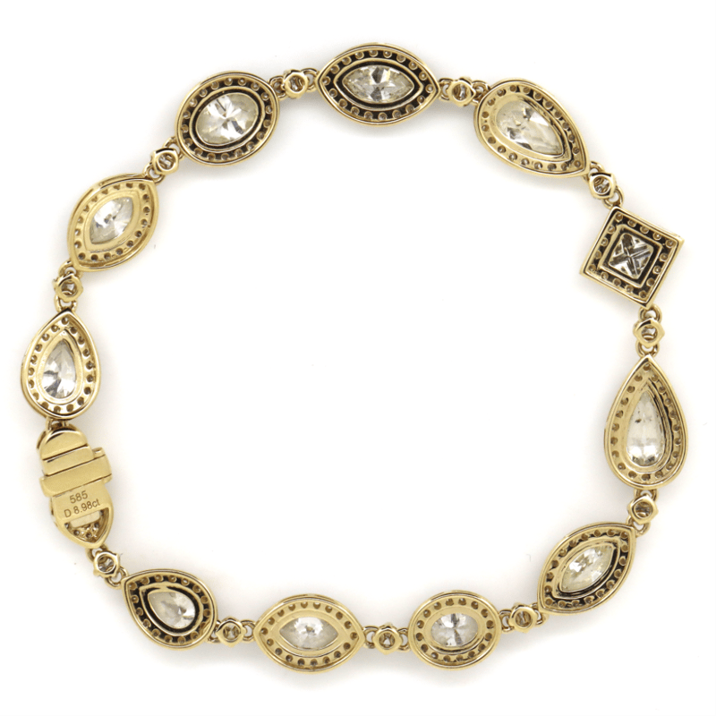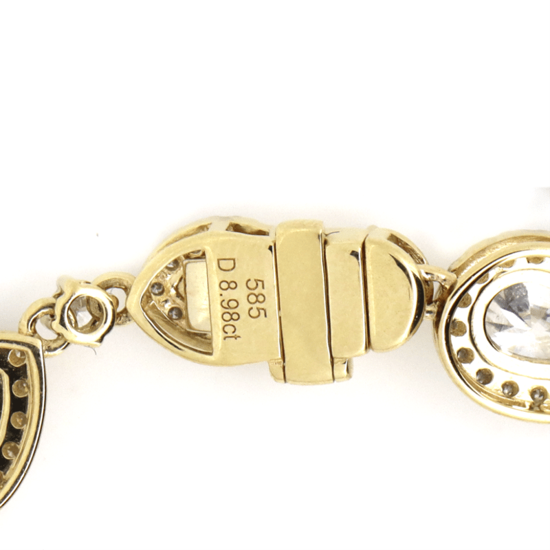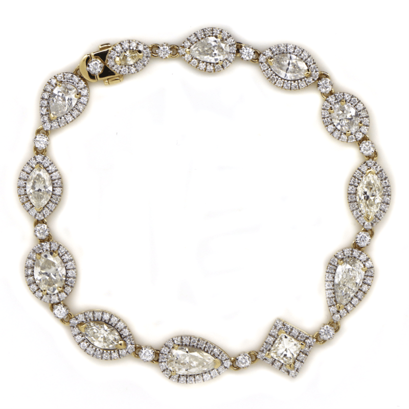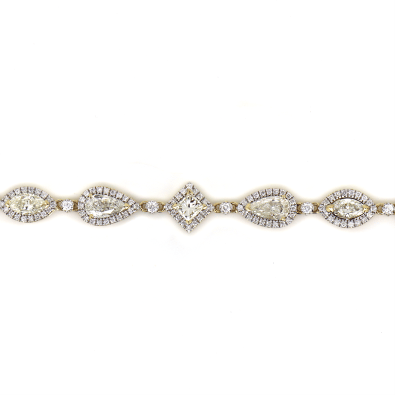 The Bracelet Features, 5 Mixed, 2 Oval Mixed, One Pear, And 4 Pear Cut, Diamonds (7.12Ct Tdw, K-L/ Light Fancy Yellow Colour, P1-P2 Clarity), Claw Set. Encompassing The Diamonds In A Halo Are, 220 Round Brilliant Cut, Diamonds (1.86Ct Tdw, G-H Colour, Si1-Si2 Clarity), Bead Set. The Bracelet Features A Concealed Box Snap Clasp With Safety Clip Attached.