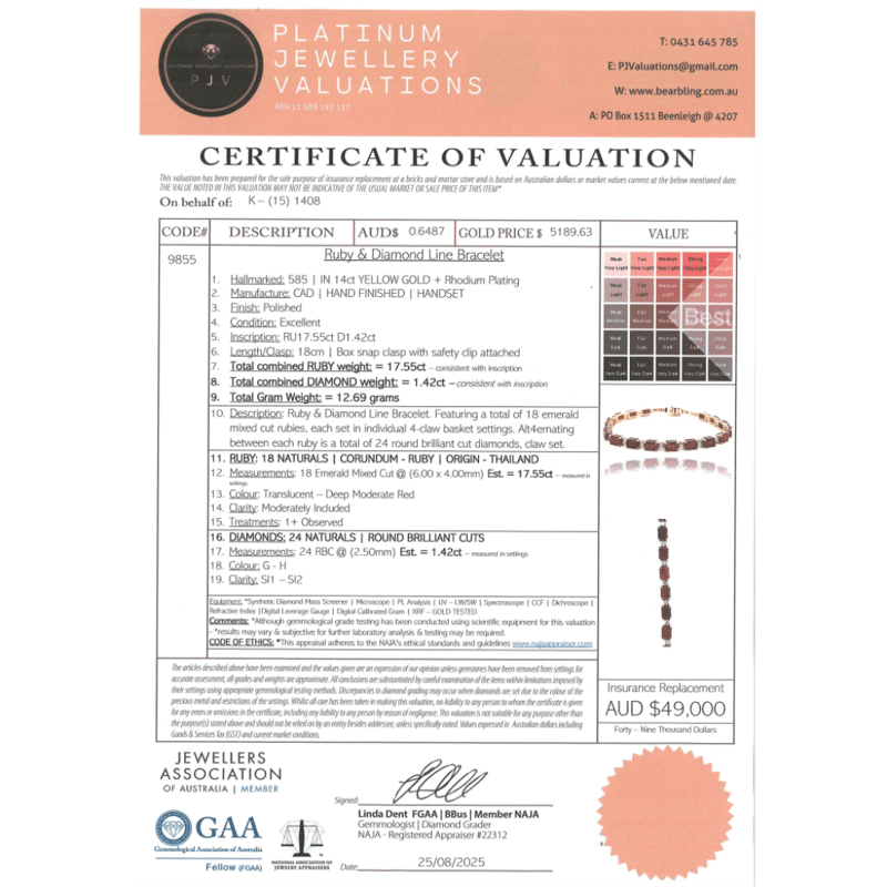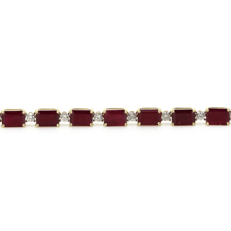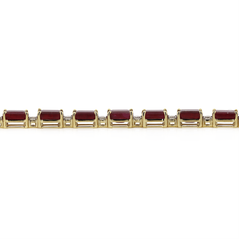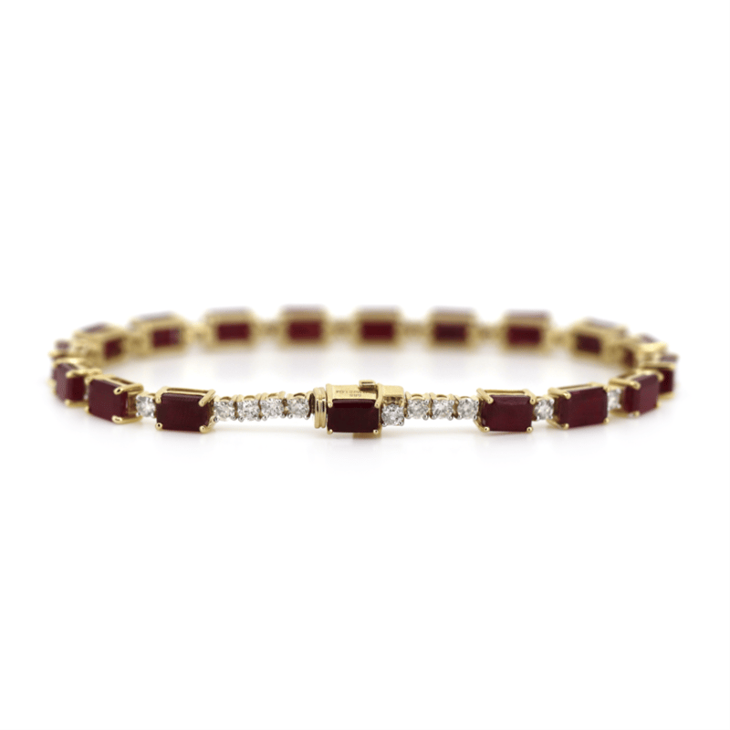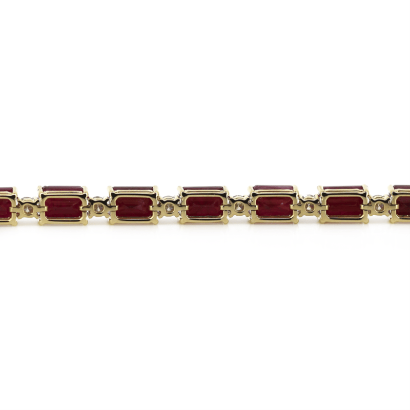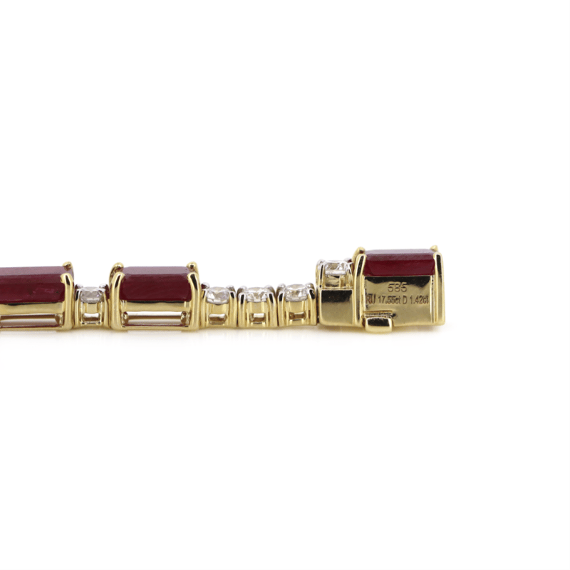 The Design Features, 18 Emerald Cut, Deep Moderate Red, Rubies (17.55Ct Tsw, Moderately Included, Enhanced), 4 Claw Set. Embellishing The Design Alternating Between Are, 24 Round Brilliant Cut, Diamonds (1.42Ct Tdw, G-H Colour, Si1-Si2 Clarity), Claw Set. The Bracelet Has A Box Clasp With A Hinged Safety Clip. Bracelet Length Is 18Cm.
