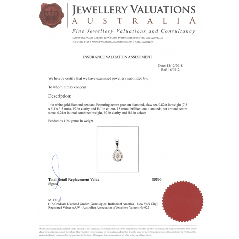 The Centre Features, One Pear Cut, Diamond (0.82Ct, H-I Colour, P2 Clarity), Claw Set. Surrounding The Centre In A Halo Are, 18 Round Brilliant Cut, Diamonds, (0.21Ct Tdw, H-I Colour, P2 Clarity), Claw Set.