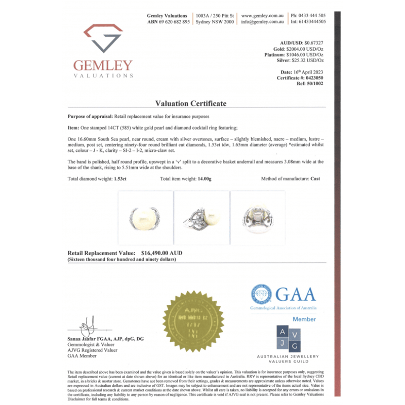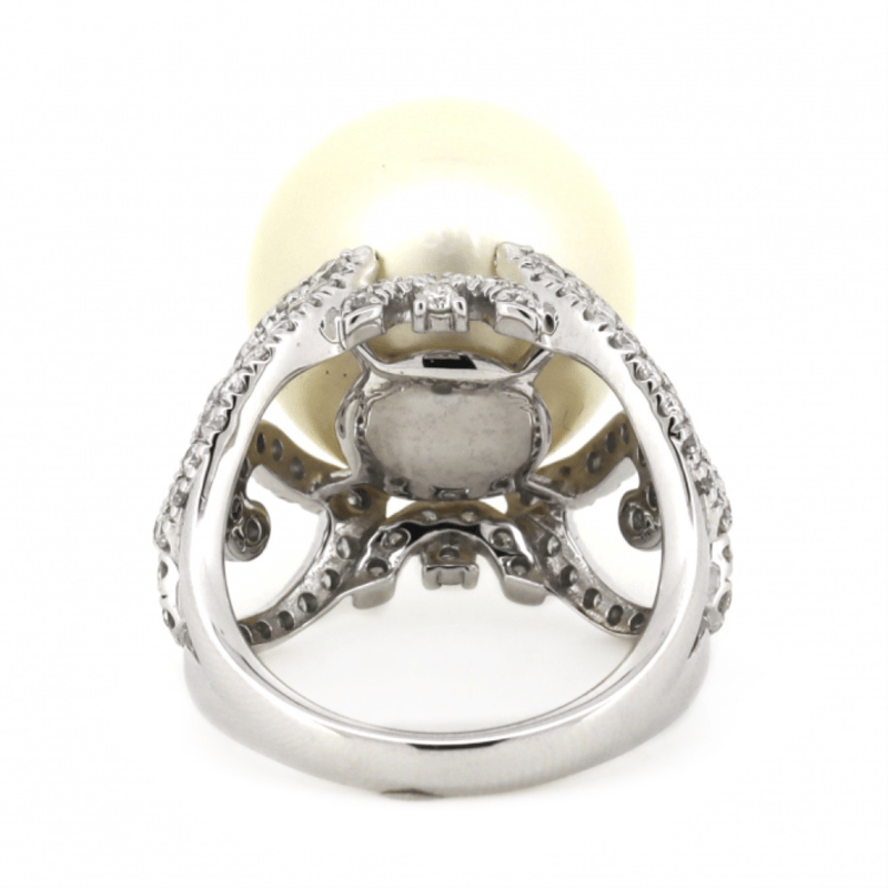 The Centre Features, One Near Round, Cream With Silver Overtones, Cultured South Sea Pearl (16.60Mm Size, Medium Lustre, Slightly Blemished), Post Set. Decorating The Setting Are, 94 Round Brilliant Cut, Diamonds (1.53Ct Tdw, J-K Colour, Si2-I2 Clarity), Micro-Claw Set. Ring Size O 1/2.