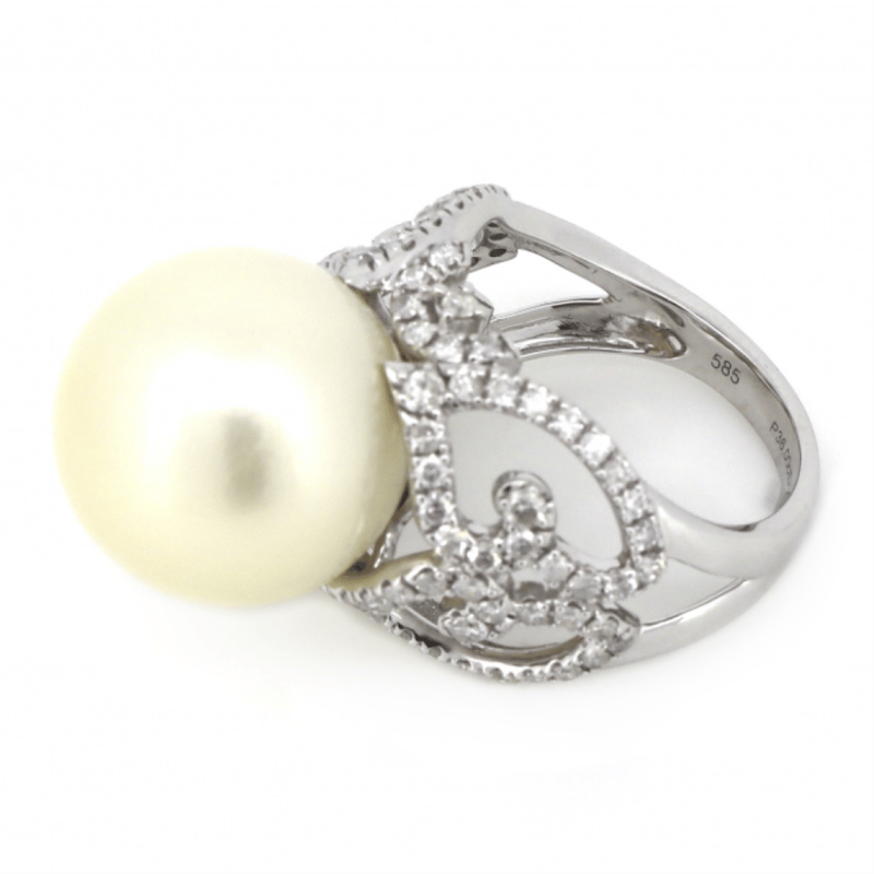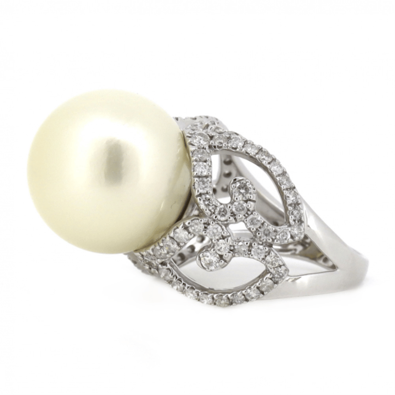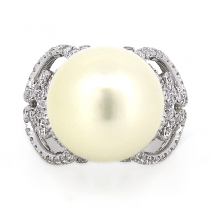 14K WHITE GOLD, WHITE CULTURED SOUTH SEA PEARL AND DIAMOND, COCKTAIL RING.