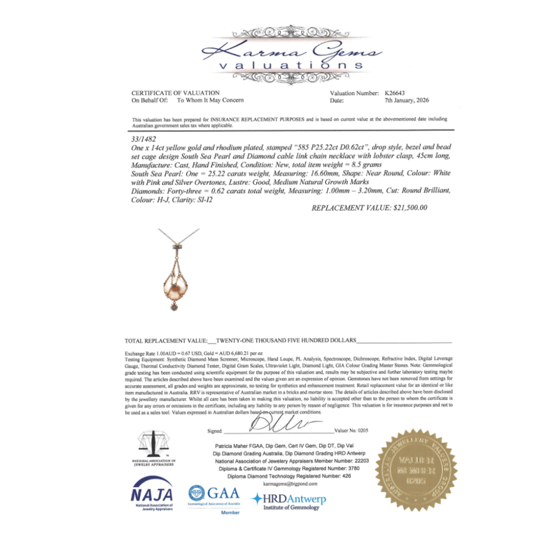 The Design Features, One Round, White/Cream With Pink And Silver Overtones, Cultured South Sea Pearl (25.22Ct/16.60Mm Size, Good Lustre, Natural Growth Marks), Unset In A "Cage" Chain. The Chain Features, 43 Round Brilliant Cut, Diamonds (0.62Ct Tdw, H-J Colour, Si-I2 Clarity), Bezel/Bead Set. The Necklace Features A Lobster Claw Clasp Closure. Necklace Length Is 45Cm.