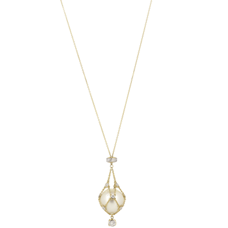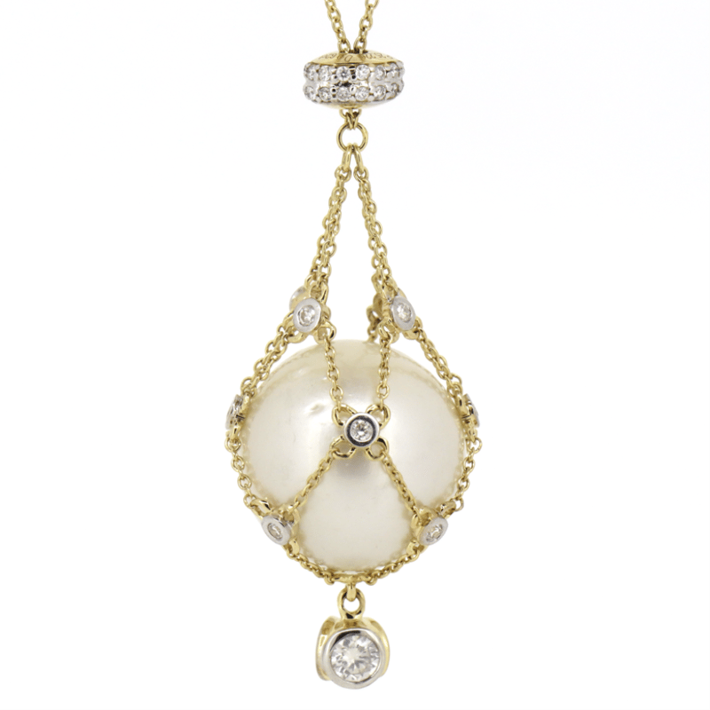 14K YELLOW GOLD, WHITE CULTURED SOUTH SEA PEARL AND DIAMOND, CAGE NECKLACE.