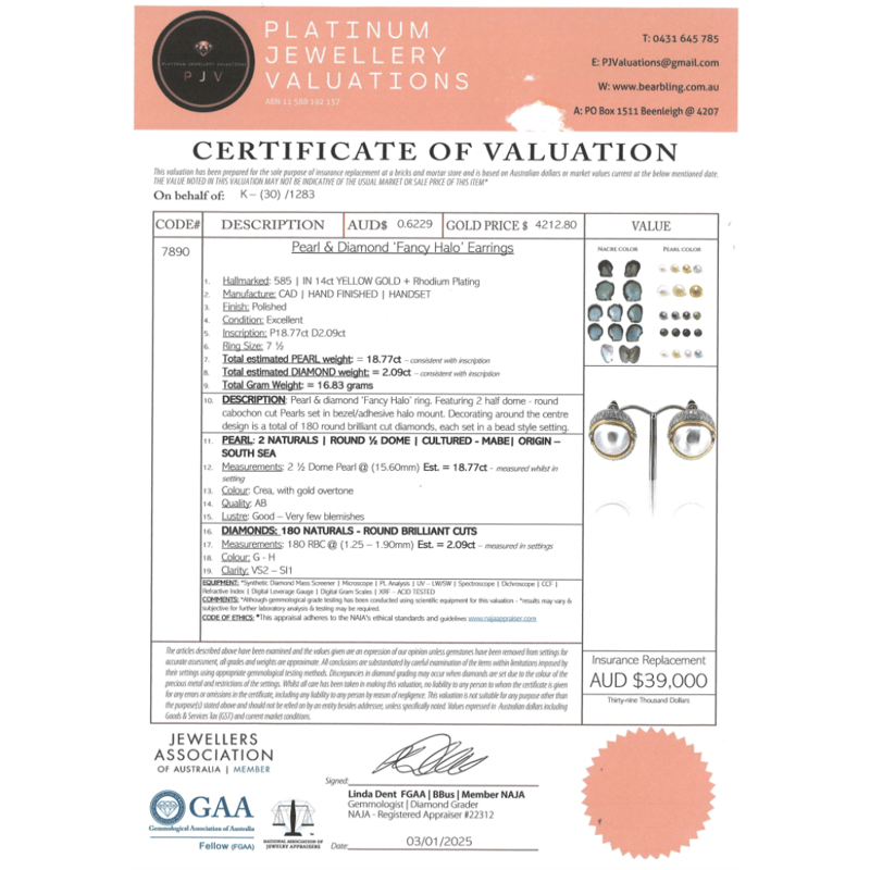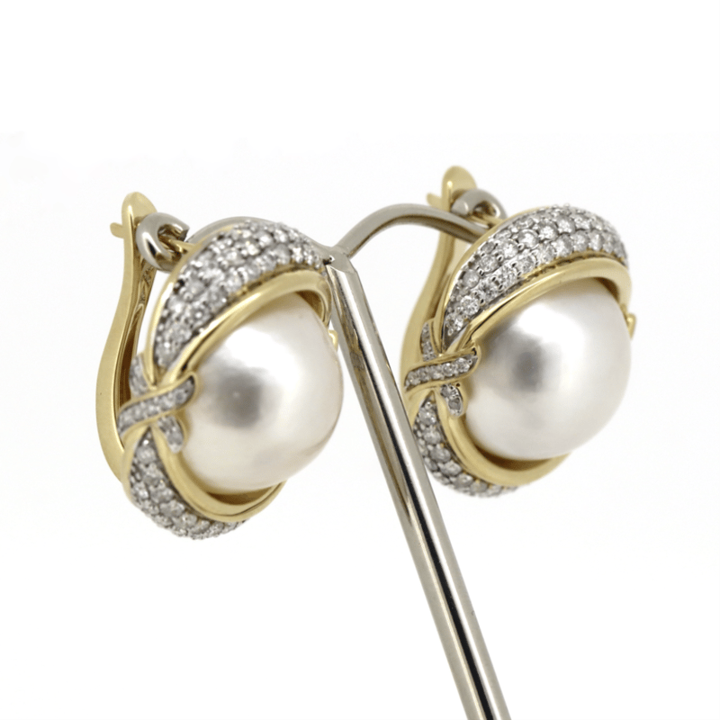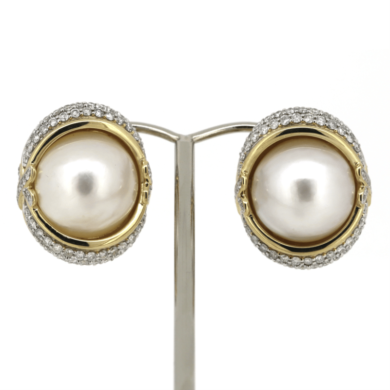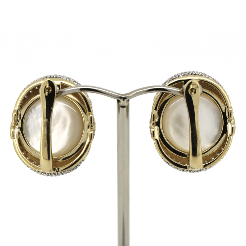 The Centres Feature, 2 Round 1/2 Dome, Cream With Gold Overtone, Cultured Mabe Pearls (18.77Ct Tsw, Lustre-Good), Bezel/Adhesive Halo Mount. Decorating The Centre Design Are, 180 Round Brilliant Cut, Diamonds (2.09Ct Tdw, G-H Colour, Vs2-Si1 Clarity), Bead Style Setting. The Earrings Have Latch Backs.