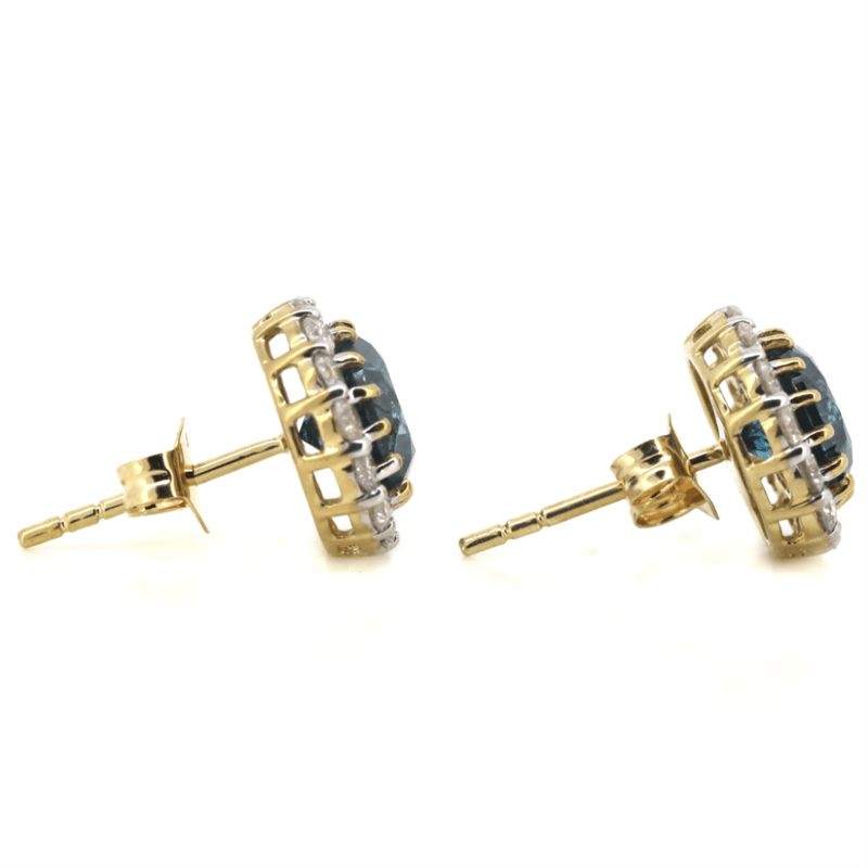 14K YELLOW GOLD, FANCY BLUE DIAMOND AND DIAMOND, HALO STUD EARRINGS.