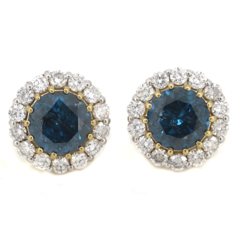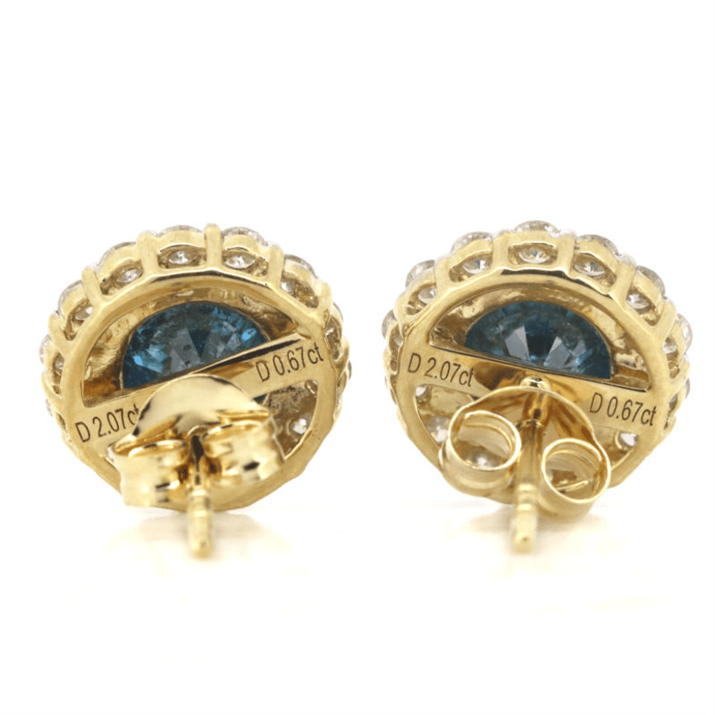 The Centres Feature, 2 Round Brilliant Cut, Fancy Vivid Blue, Diamonds (2.07Ct Tdw, Hpht Colour Enhanced, Slightly Included), 4 Claw Set. Surrounding The Centres In Halos Are, 28 Round Brilliant Cut, Diamonds (0.67Ct Tdw, G-H Colour, Si1-Si2 Clarity), Claw Set. The Earrings Have Post Backs, With 14K Yellow Gold Butterfly Clasps.