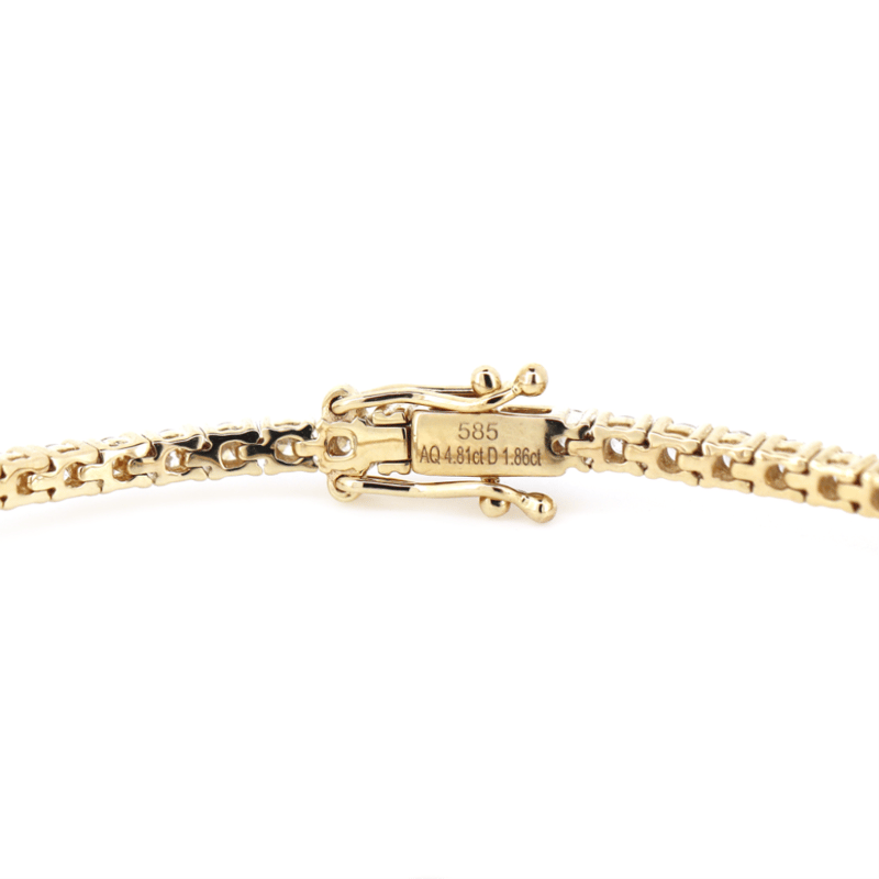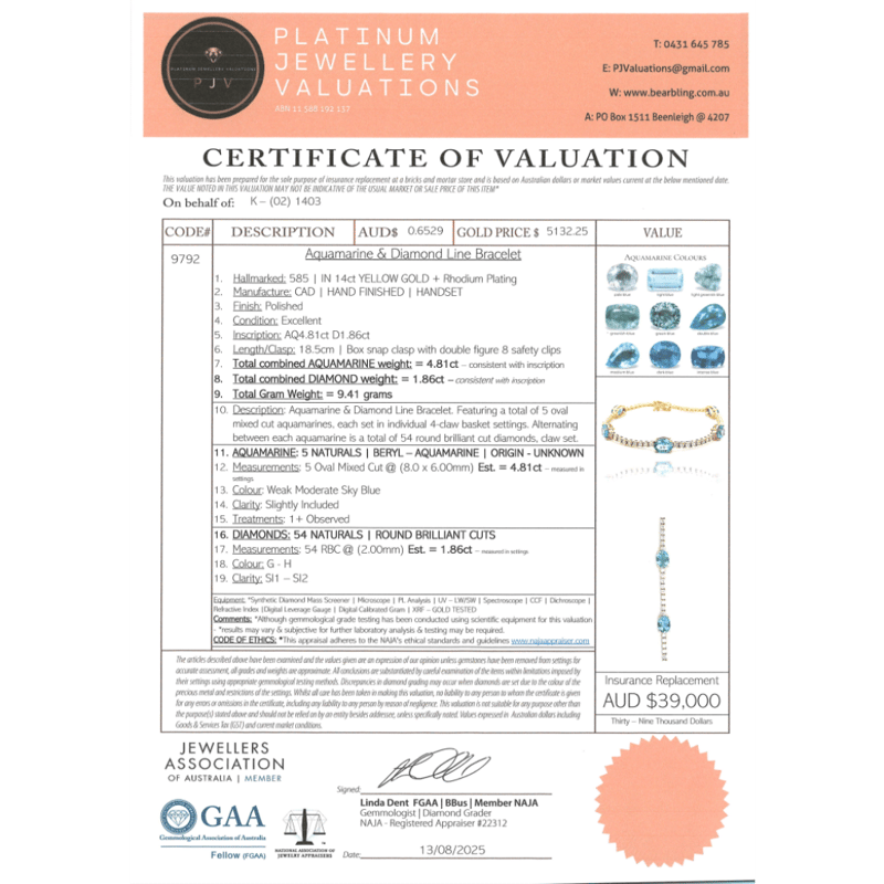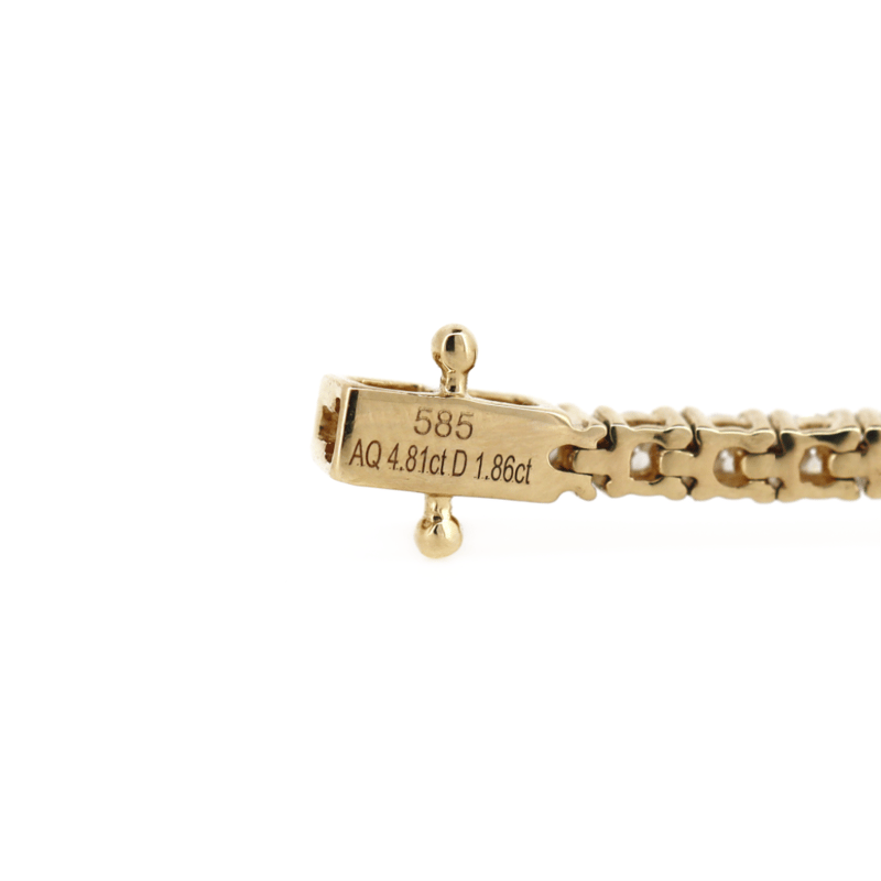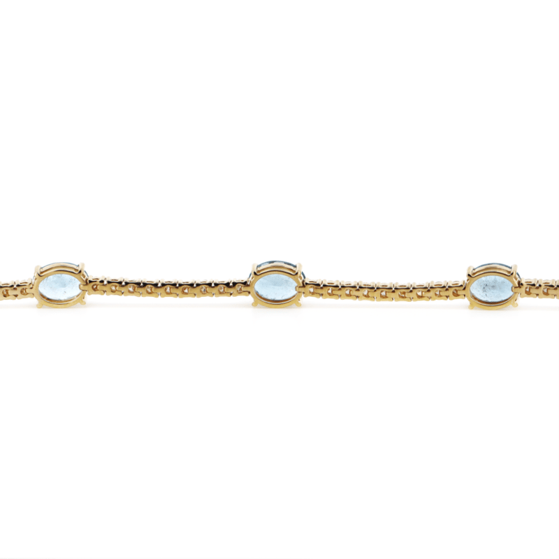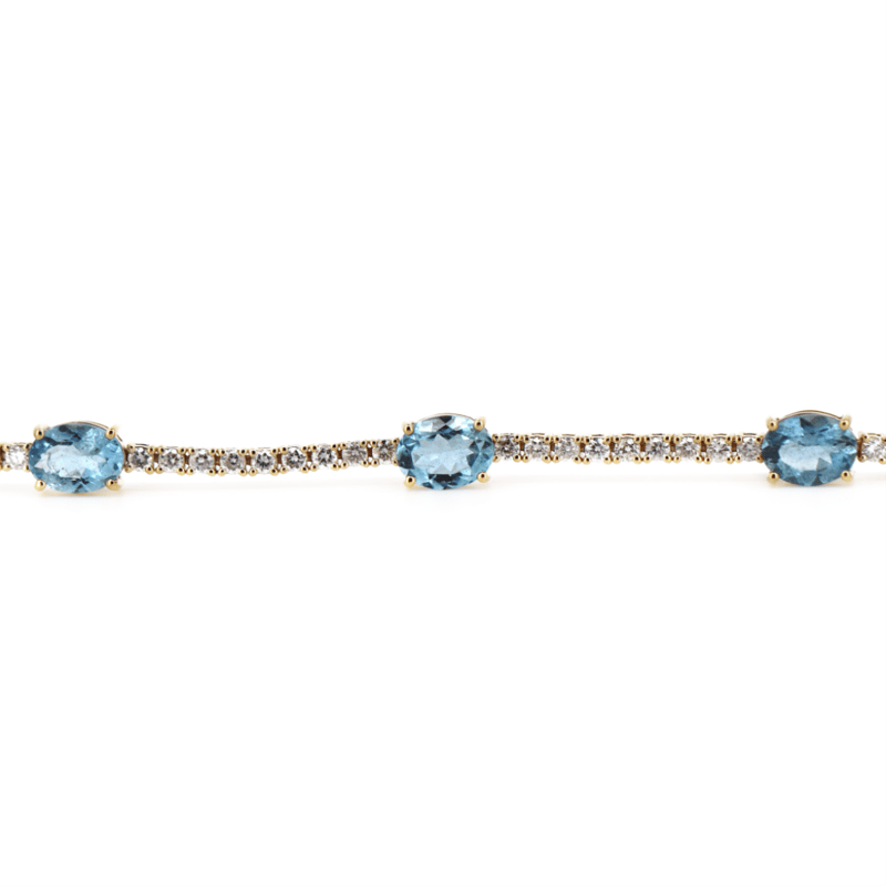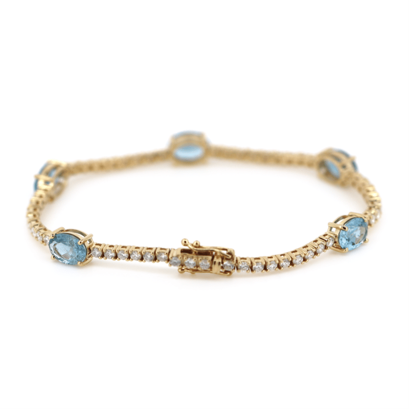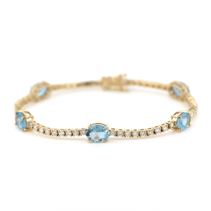 The Design Features, 5 Oval Cut, Weak Moderate Sky Blue, Aquamarines (4.81Ct Tsw, Slightly Included), Claw Set. Alternating Between Are, 54 Round Brilliant Cut, Diamonds (1.86Ct Tdw, G-H Colour, Si1-Si2 Clarity,), Claw Set. The Bracelet Has A Hidden Box Lock Closure With 2 Safety Clips. Bracelet Length Is 18.5Cm.