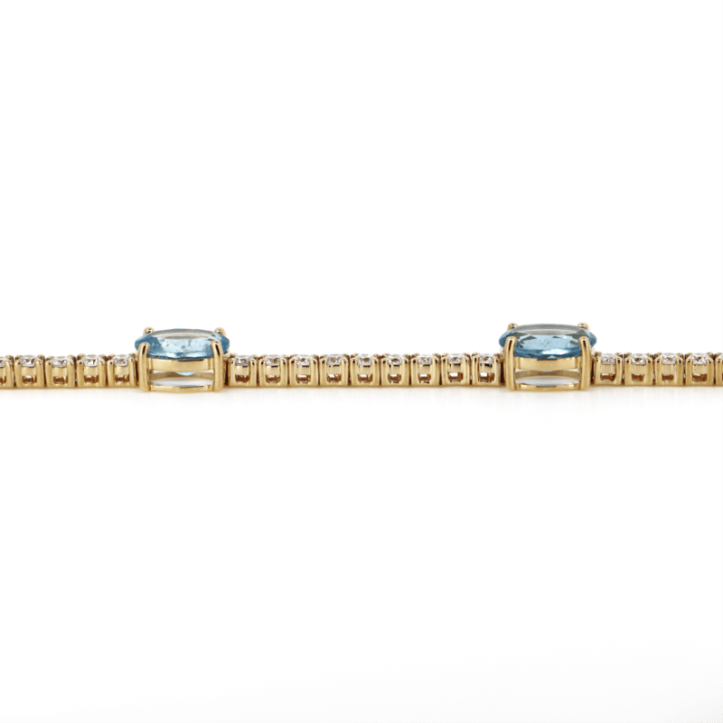 14K YELLOW GOLD, AQUAMARINE AND DIAMOND, LINE BRACELET.