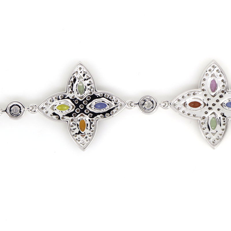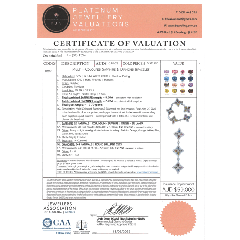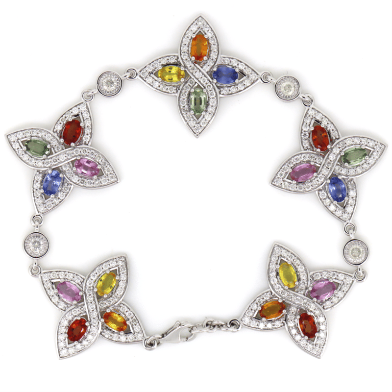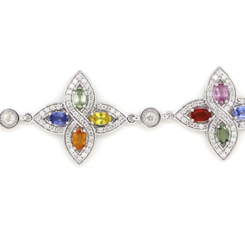 The Bracelet Features, 20 Oval Mixed Cut, Reddish Orange, Orange, Yellow, Blue, Green, Pink, Lilac And Purple, Sapphires (5.29Ct Tsw, Slightly Included), Pip Claw Set. Encompassing The Sapphires Are, 249 Round Brilliant Cut, Diamonds (2.73Ct Tdw, G-H Colour, Si1-Si2 Clarity), Bead Set. The Bracelet Features A Lobster Clasp And Is 17Cm.