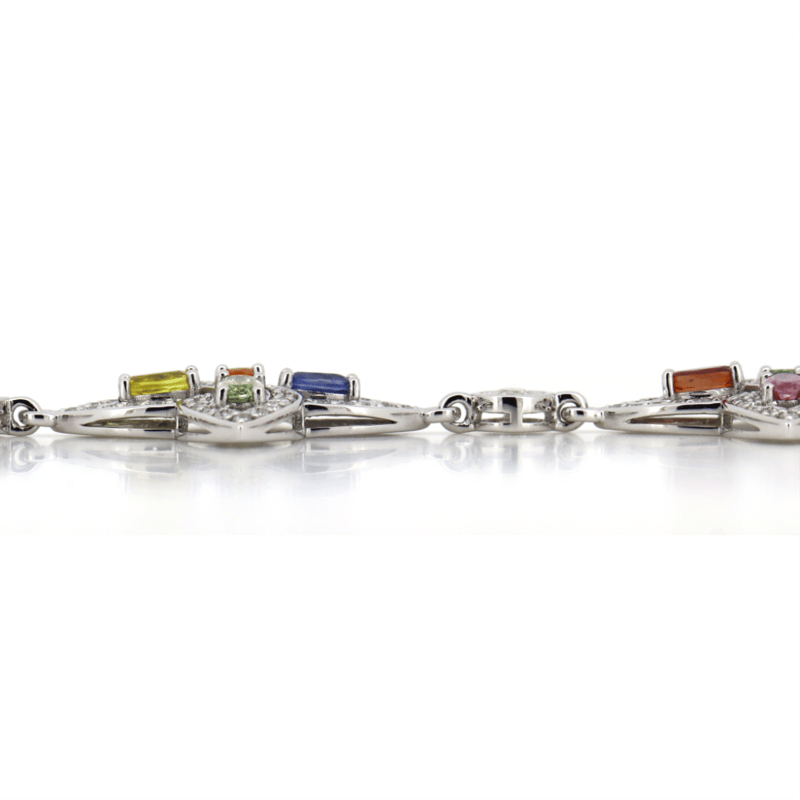 14K WHITE GOLD, MULTI-COLOURED SAPPHIRE AND DIAMOND BRACELET.