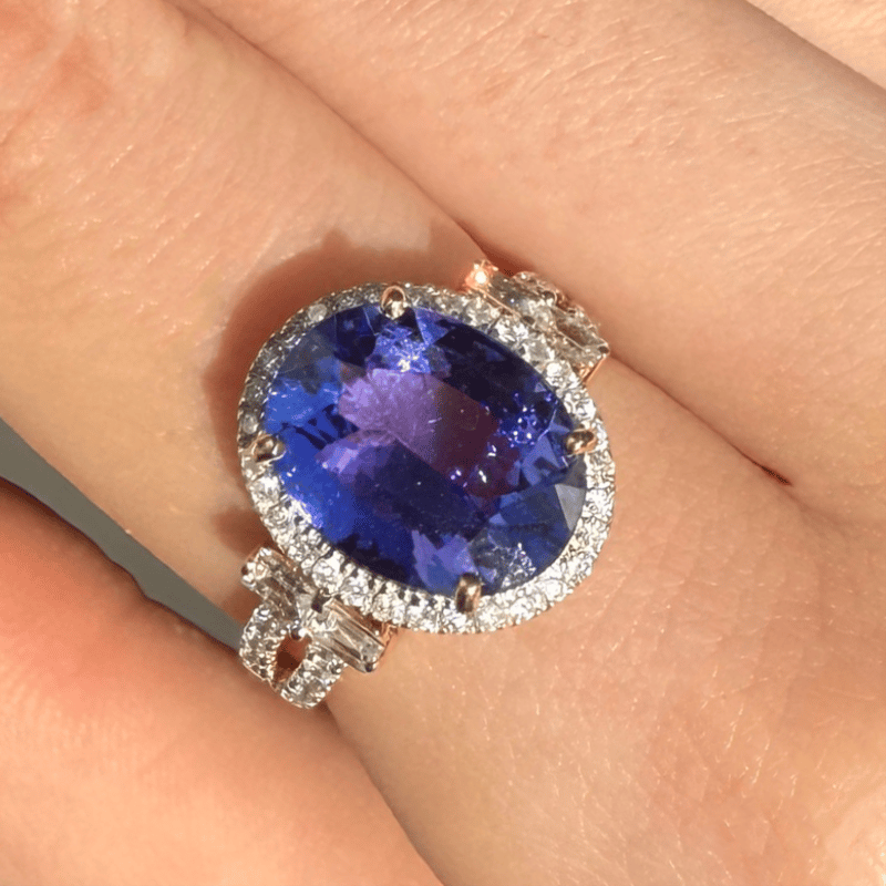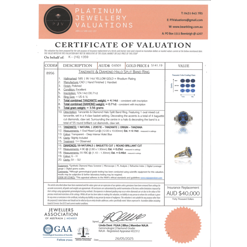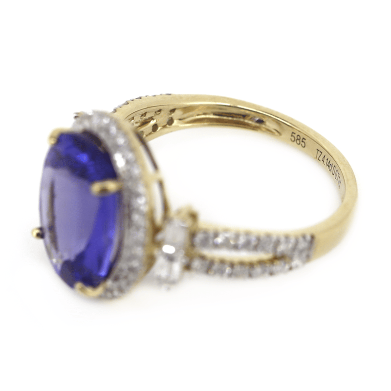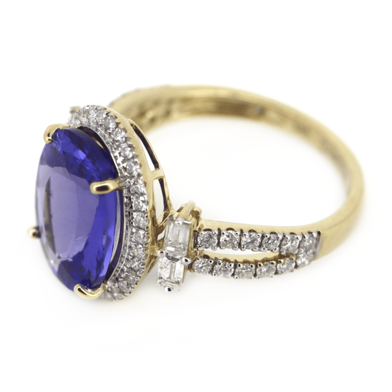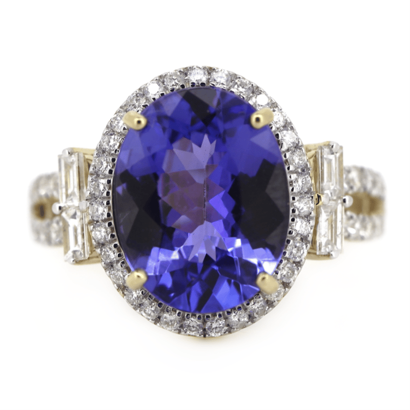 The Centre Features, One Oval Faceted Cut, Deep Intense Violet Blue, Tanzanite (4.14Ct, Slightly Included), 4 Claw Set. Decorating The Accents Are, 4 Baguette Cut, Diamonds (0.25Ct Tdw, G-H Colour, Si1-Si2 Clarity). Surrounding The Centre In A Halo And Decorating The Band Are, 55 Round Brilliant Cut, Diamonds (0.46Ct Tdw, G-H Colour, Si1-Si2 Clarity), Claw Set. Ring Size N.