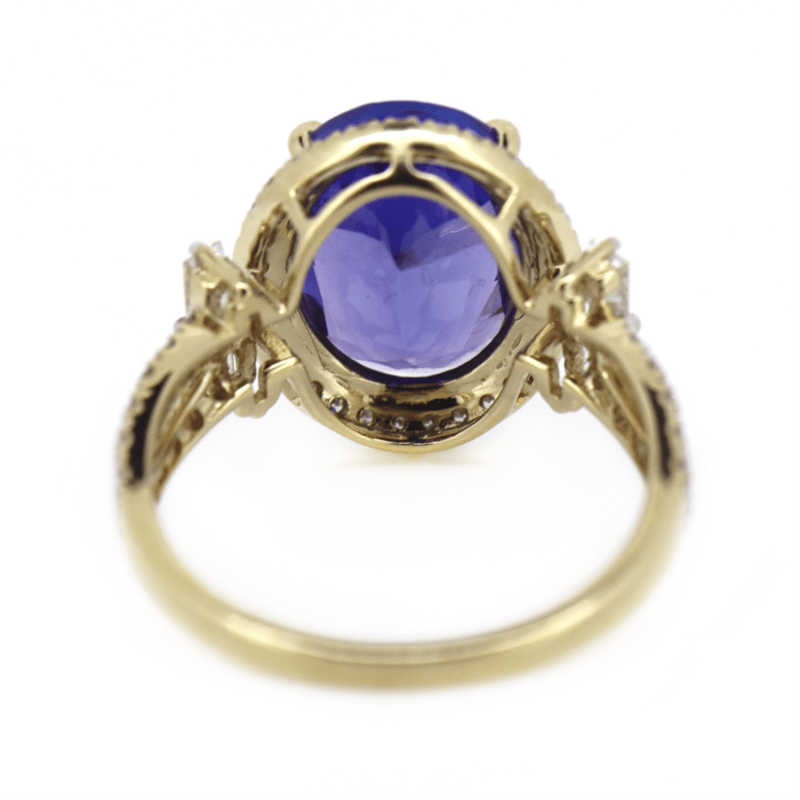 14K YELLOW GOLD, TANZANITE AND DIAMOND, HALO SPLIT BAND RING.