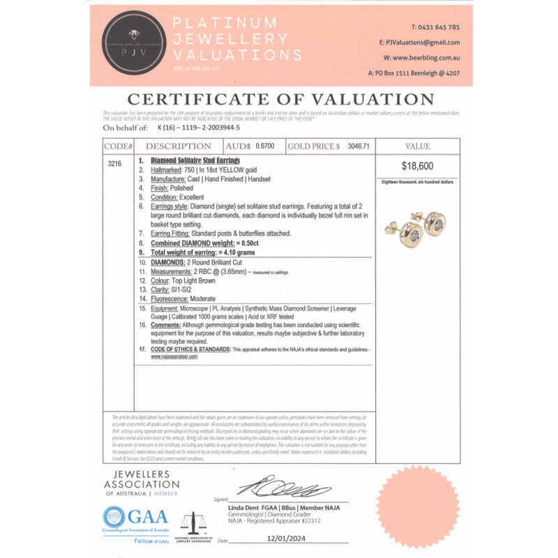 18K YELLOW GOLD, 0.50CT TOP BROWN DIAMOND, SOLITAIRE STUD EARRINGS.