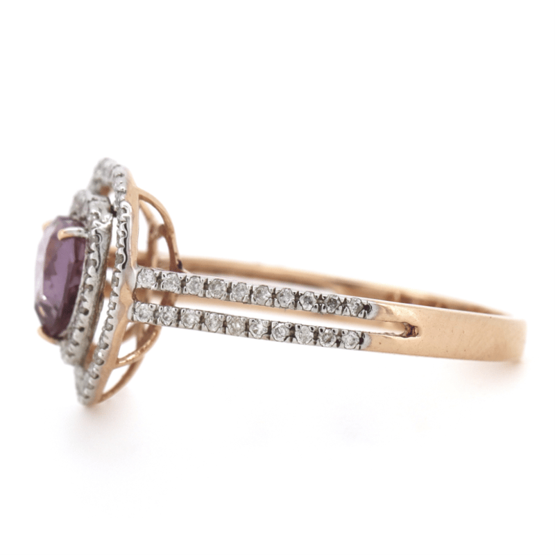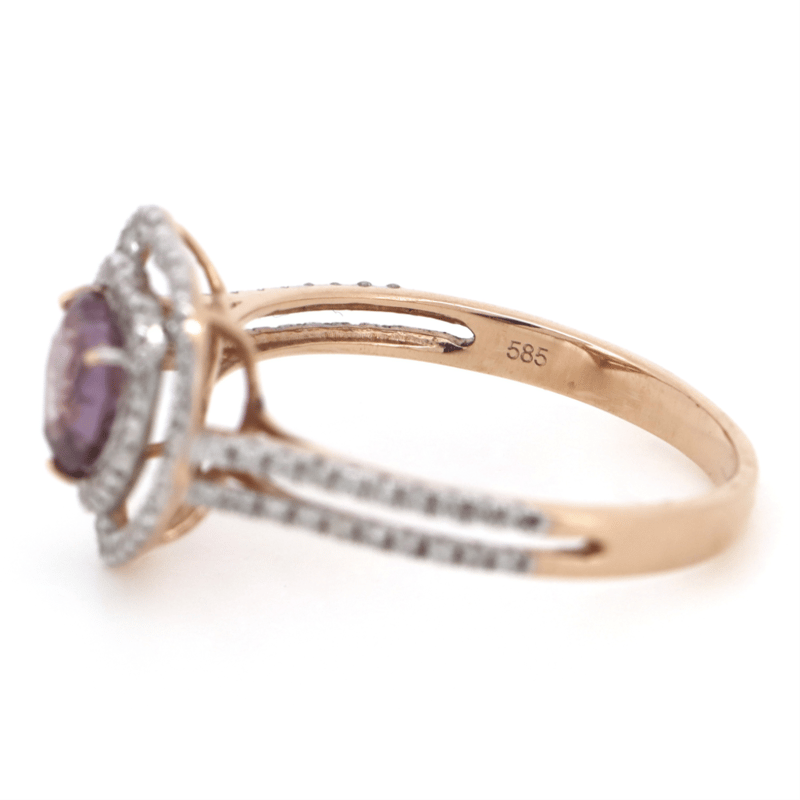 14K ROSE GOLD, PINK SAPPHIRE AND DIAMOND, DOUBLE HALO RING.