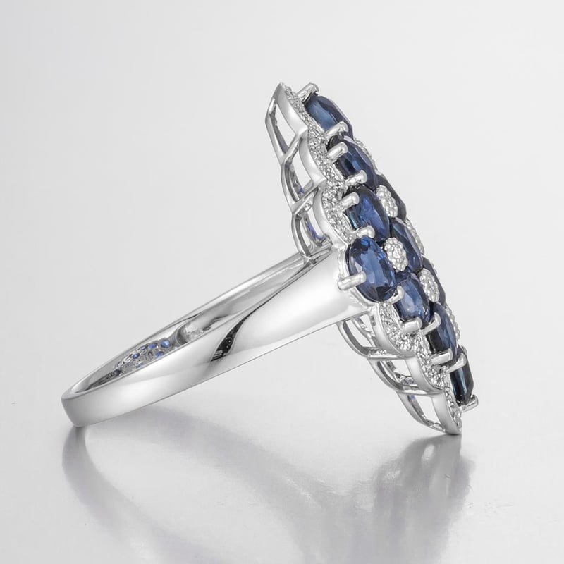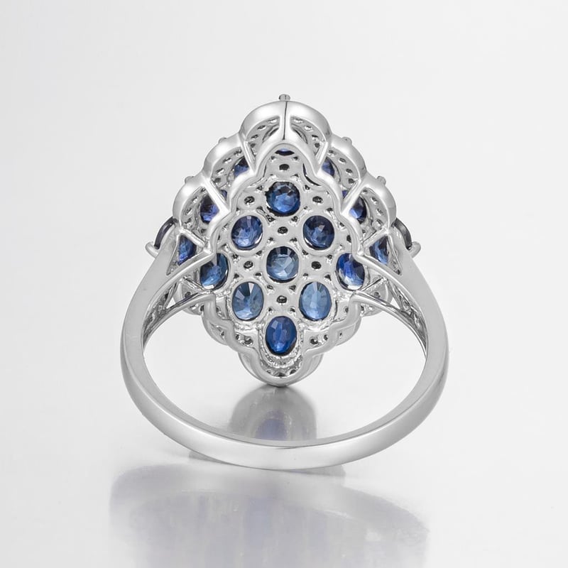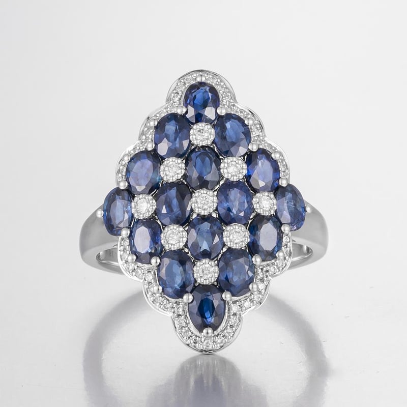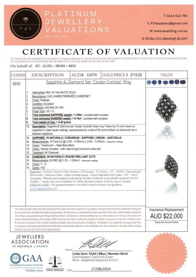 Featuring Centre, 16 Oval Cut, Deep Blue Black Australian Sapphires (3.95Ct Tsw, Heavily Included), Claw Set, With 59 Round Brilliant Cut Diamonds (0.18Ct Tdw, F-G Colour, Vs2 Clarity), Bead Set. Ring Size O.