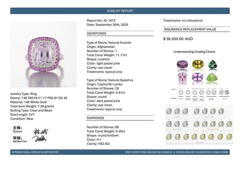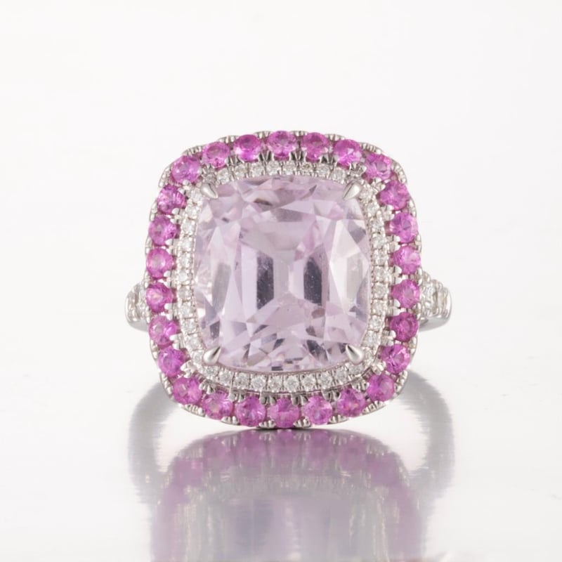 Featuring Centre, One Cushion Cut, Light Pastel Pink Afghan Kunzite (11.17Ct, Eye Clean), Claw Set, With 26 Round Cut, Dark Pastel Pink Ceylon Sapphires (0.81Ct Tsw, Eye Clean), Claw Set, And 66 Round Brilliant Cut Diamonds (0.45Ct Tdw, H-I Colour, Vs2-Si2 Clarity), Claw/Bead Set. Ring Size O.
