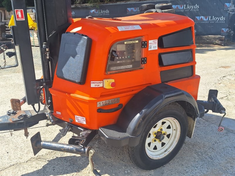 Description/Extras: Trailer Mounted Light Tower, Powered By A Kubota Diesel Engine, LED Tower, Digital Ground Control, Electric Start, Battery Isolater, E-Stop, 50mm Hitch, Lifting Lugs, Chains, Stabilisation Legs, Jockey Wheel, 7-Pin Round Female Connection, Handbrake, Rear Forklift Pockets, Top Mount Central Lifting Point