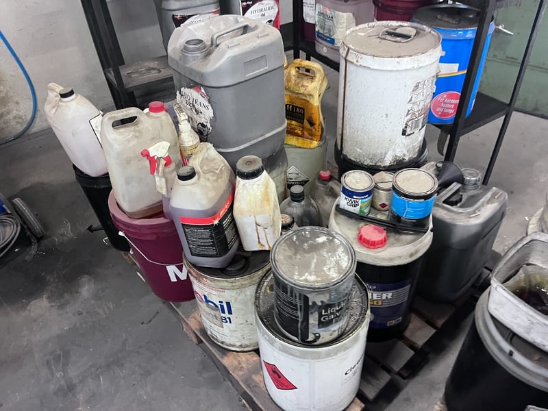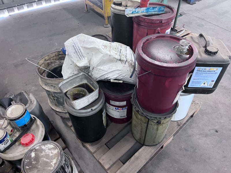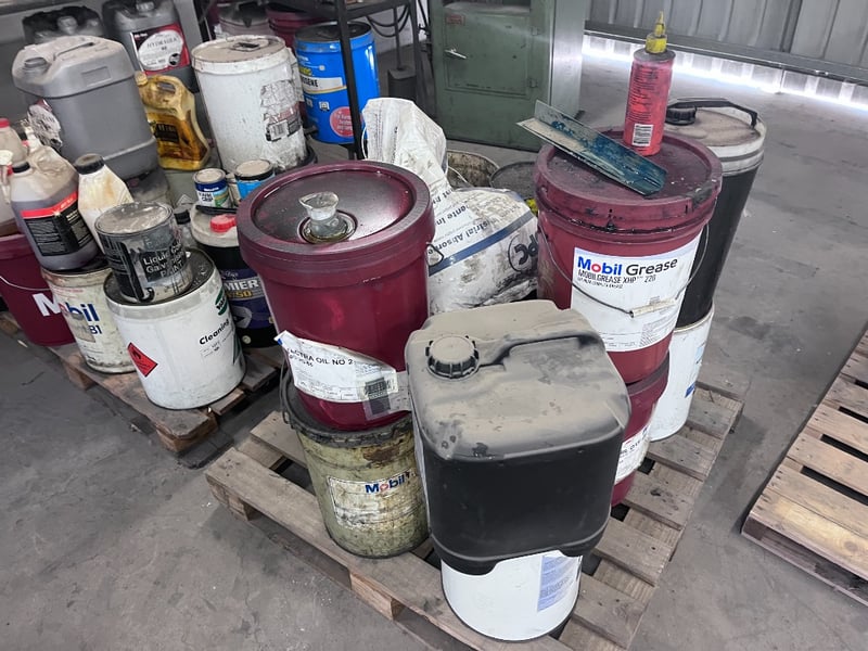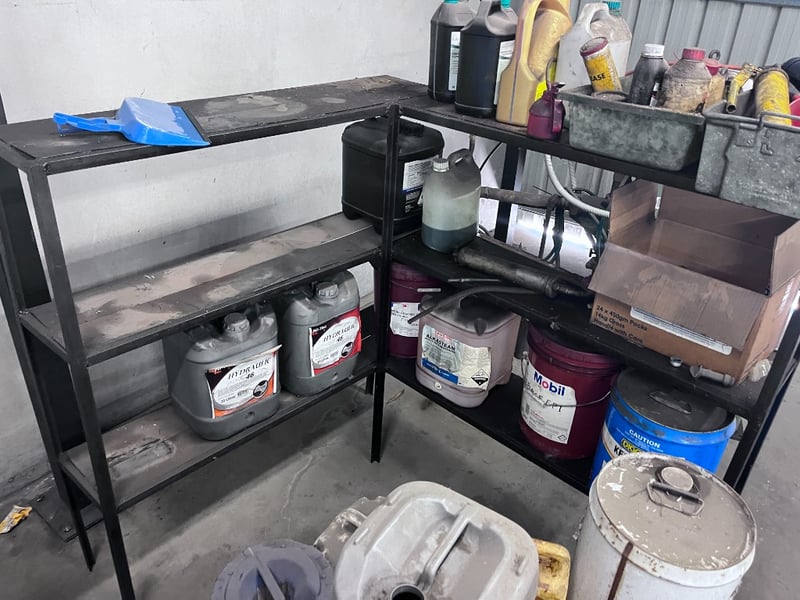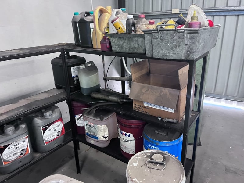 Bulk Lot of Hydraulic Oils, Misc Oils and Shelving.