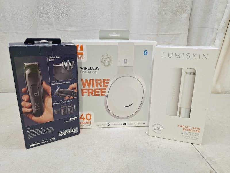 King C. Gillette Beard Trimmer, Liquid Ears Wirefree Over-Ear Headphones & LumiSkin Facial Hair Remover SOLD AS LOT