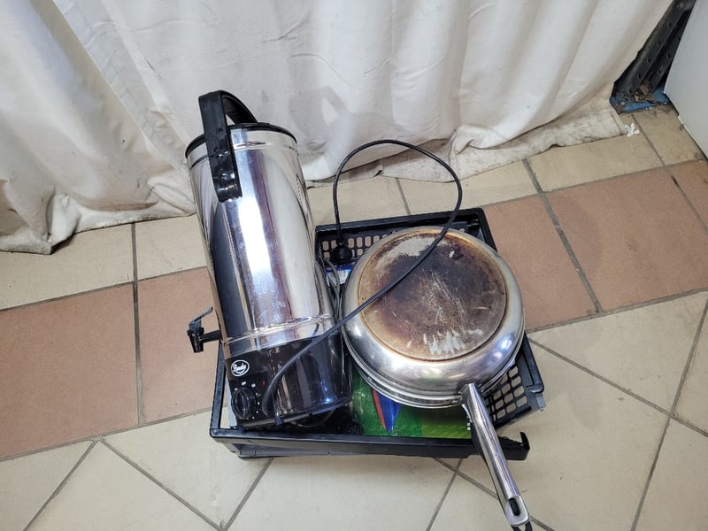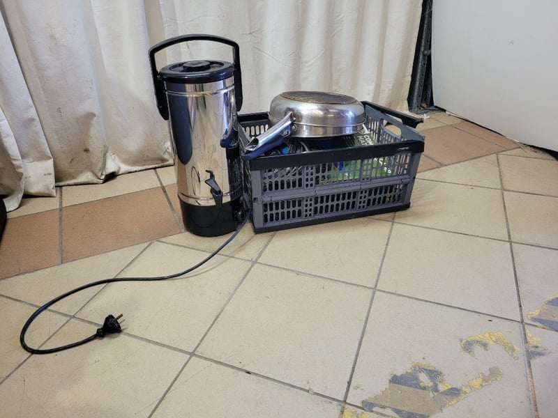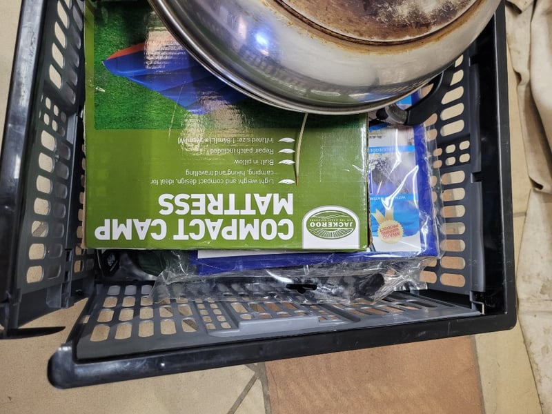 Camping Items Including Mattress, S/Steel Frying Pans, 10L Hot Water Dispenser & More Dimensions: L50 x W40 x H40cm SOLD AS LOT