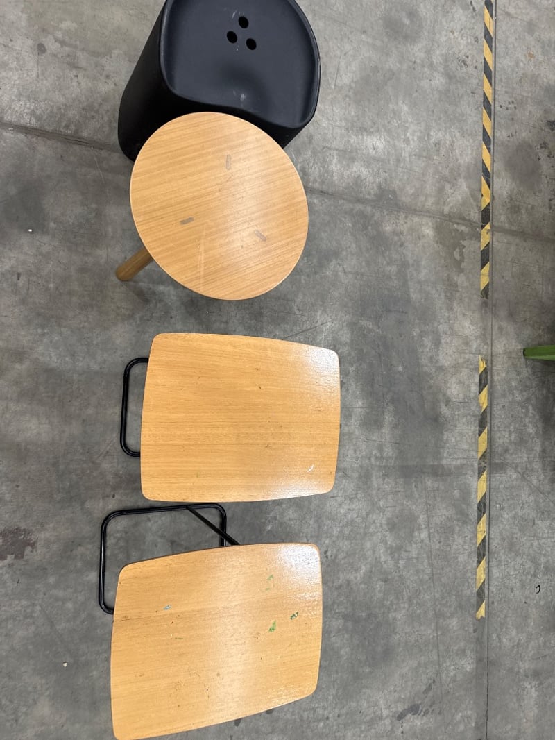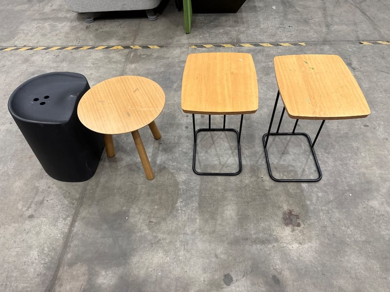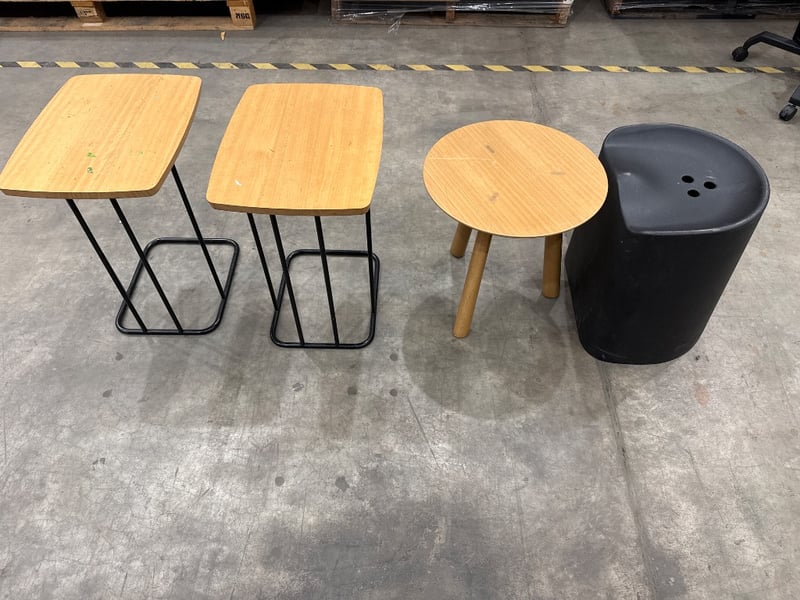 Side Table/ Stool, 3 xAssorted Side Tables colours include Timber type/ Black, 1x Stool Black. Quantity- 4, sold as lot.