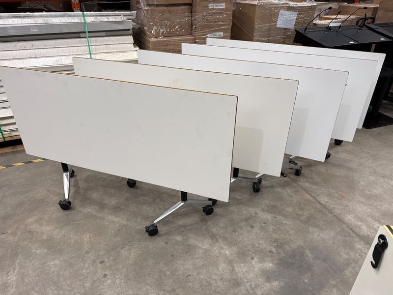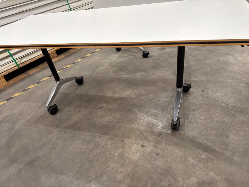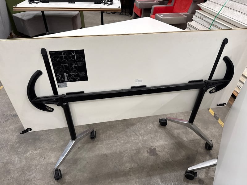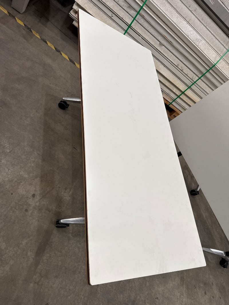 Desk, Wilkhahn, Foldable Top, Laminex Parchament, Square edge, Colour White, Legs Black/ Grey. On wheels.