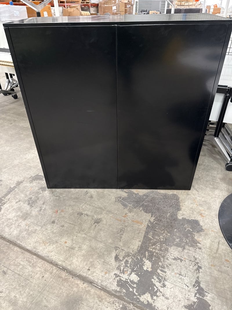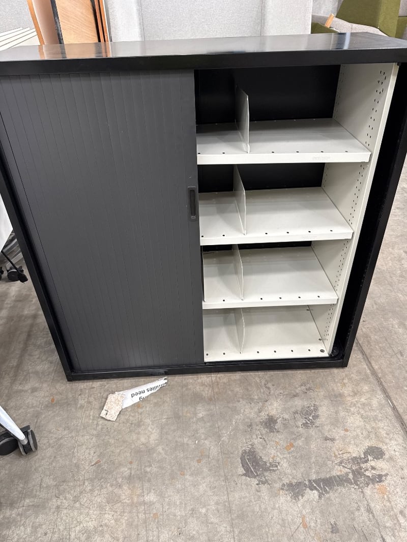 Filing Unit, Dexion Cabinet, Colour Black/ white. Missing one roller door. Approx dimensions- 121h X 120w X 46d.