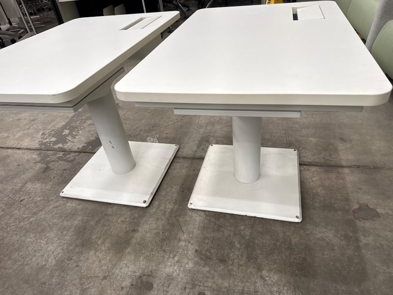 Tables, Sliding table top, Colour White, Cutout for PowerPoint connection. Approx dimensions- 73h X 120w X 80d. Quantity-2 tables, sold as lot.