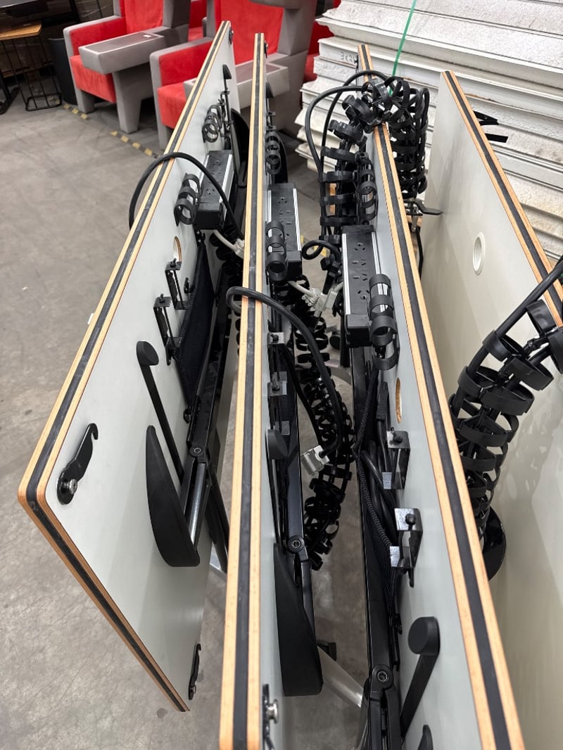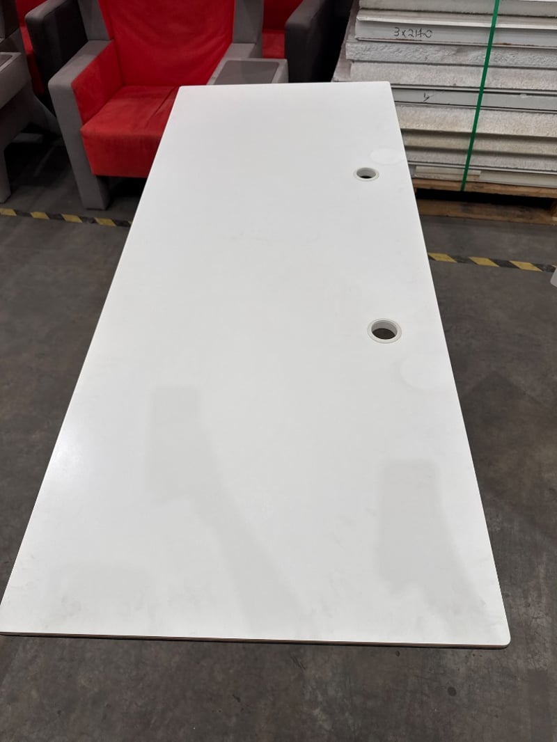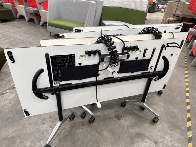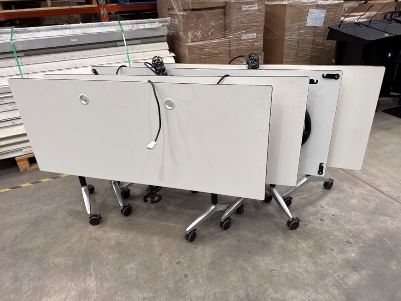 Desk, Wilkhahn, Foldable Top, Laminex Parchament, Square edge, Colour White, Legs Black/ Grey. On wheels.