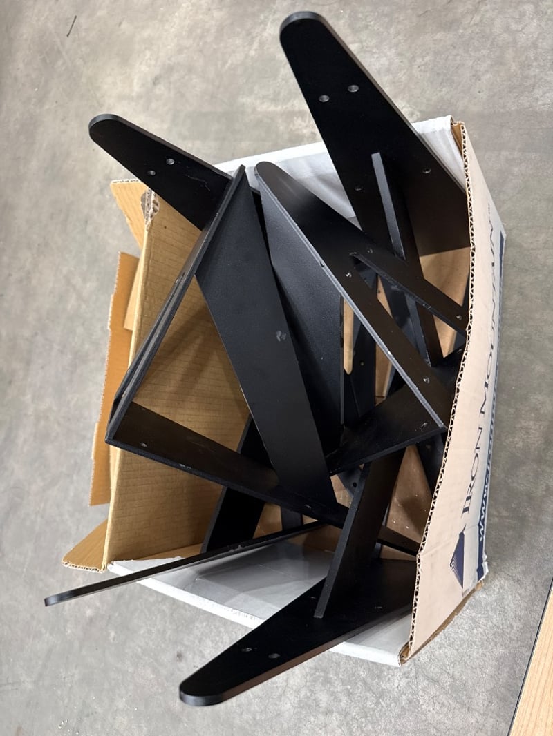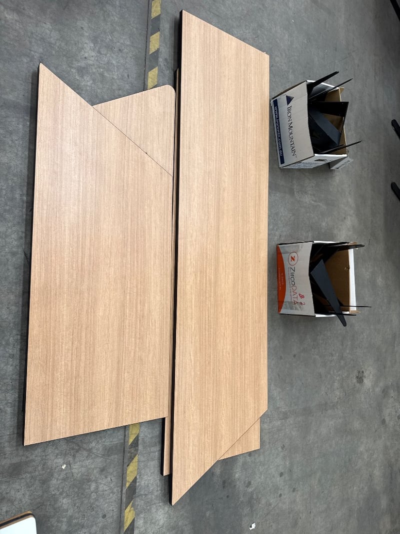 Wall Mount Table Tops, includes table tops Timber type and Black Wall Brackets. 4x Table Tops, 11X Brackets. Approx Dimensions- 2x Table tops- 142w x 60l X 3d. 2x Table Tops- 233w x 60l x 3d. Quantity-4x Table Tops, 11X Brackets, Sold as lot.
