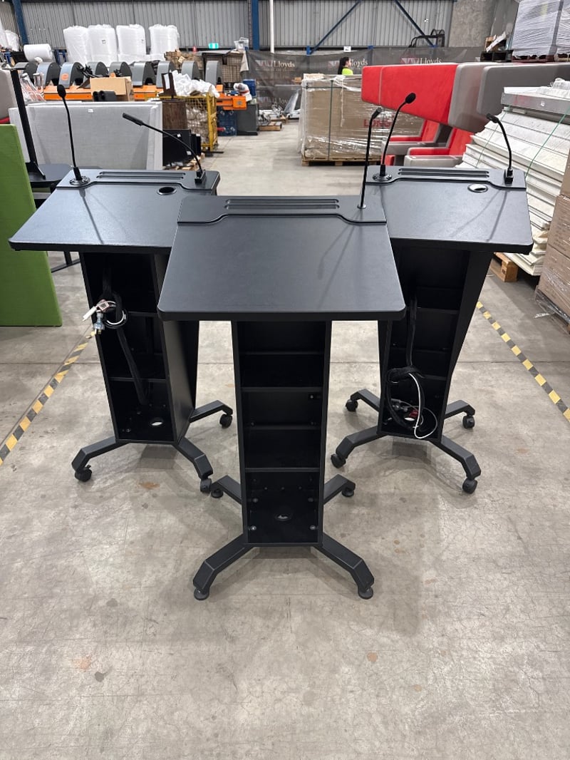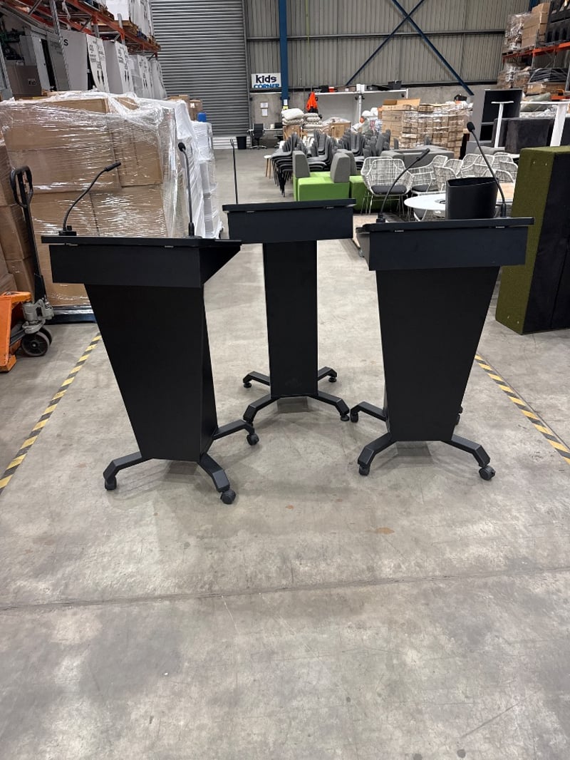 Stand, Lecture podium, Microphone attached, Black, Pull up lid. 2 x on wheels. Quantity-3, sold as lot.