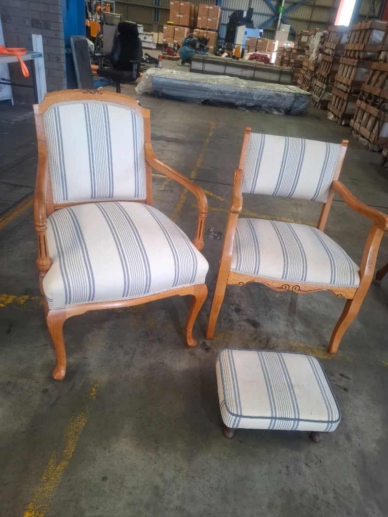 Assortment lot of chairs with foot stool