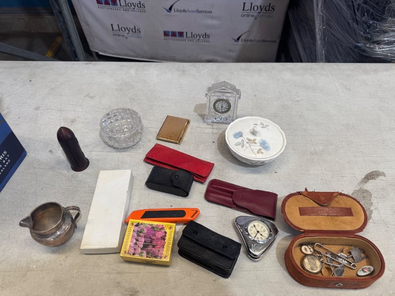 Assorted lot of homewares and good including small clocks pens and crystal dish