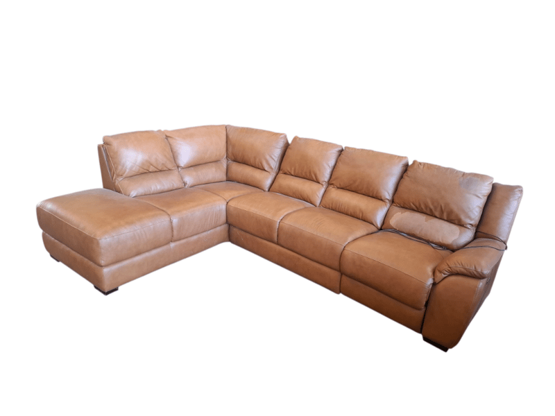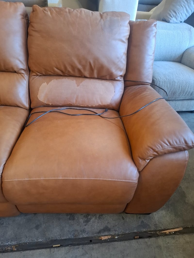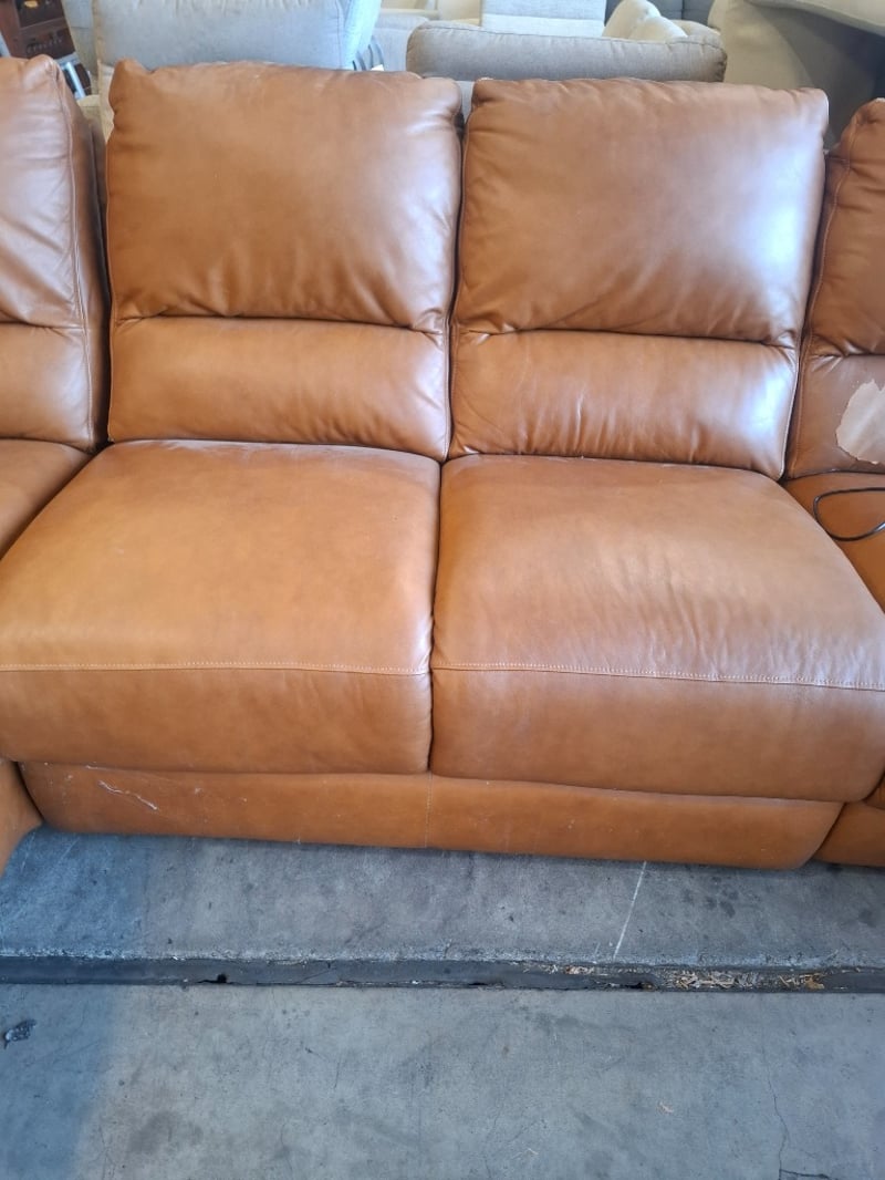 5 Seater lounge suite, Tan, Leather, Electric, USB Charging Portdimensions: 3000mm(W) x 2050mm(D) x 900mm(H) Note: Material Damage, inspection recommended, cleaning required