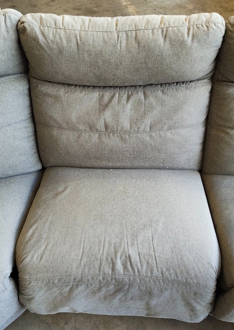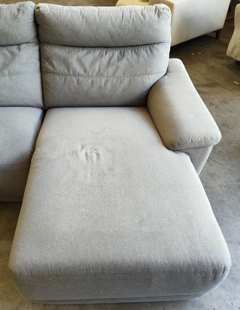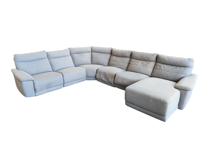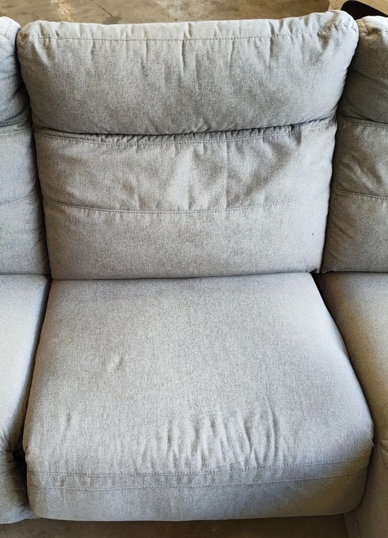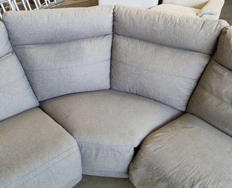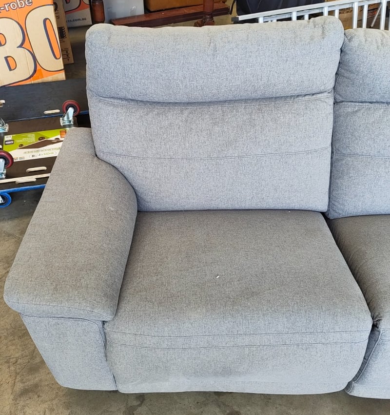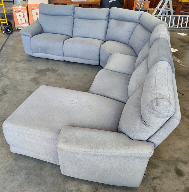 6 seater electric reclining lounge suite, light grey. dimensions: 250cm x 360cm x 100Note: darker fade on half the lounge, inspection recommended, cleaning required