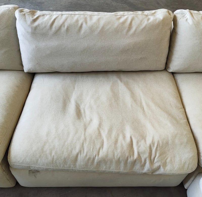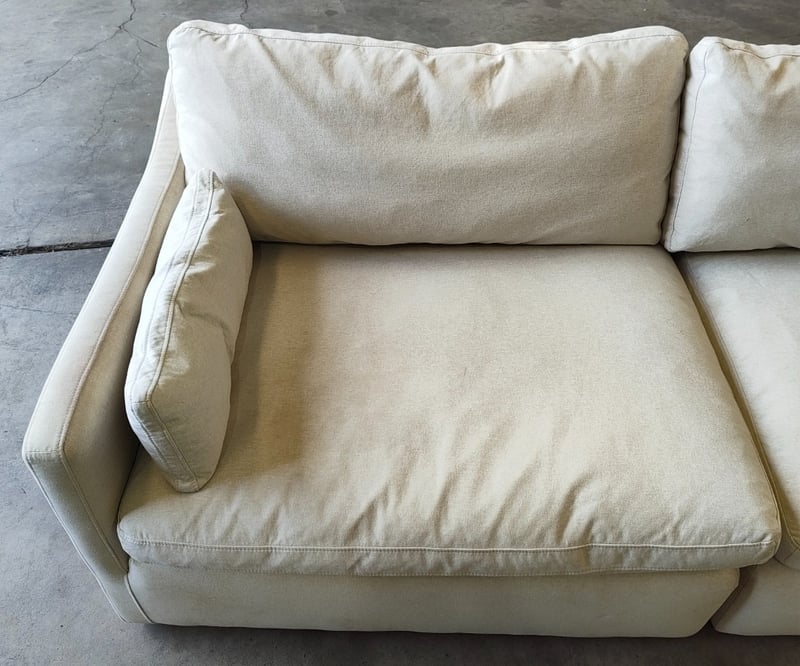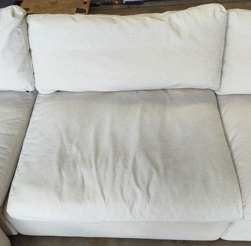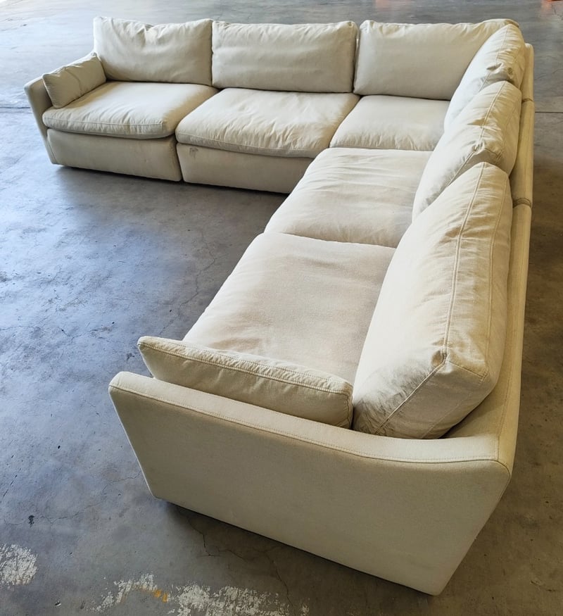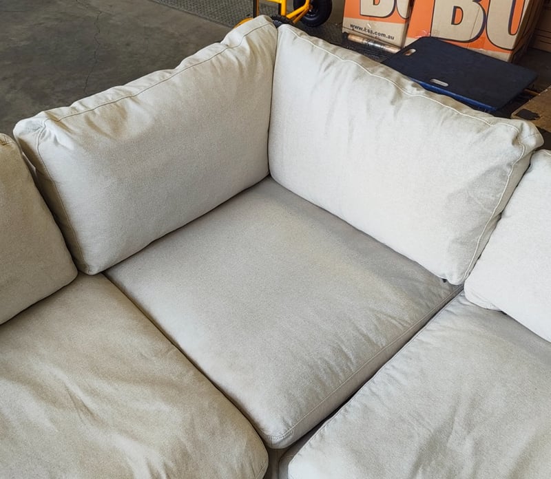 5 seater lounge suite, light grey/cream fabric. dimensions: 305cm x 305cm x 80cm Note: inspection recommended, cleaning required