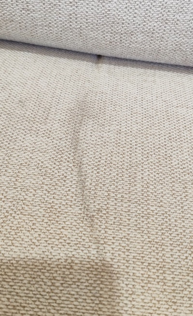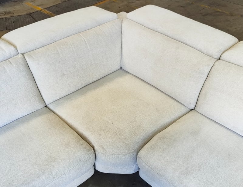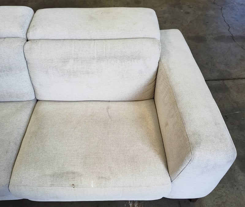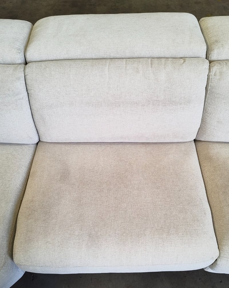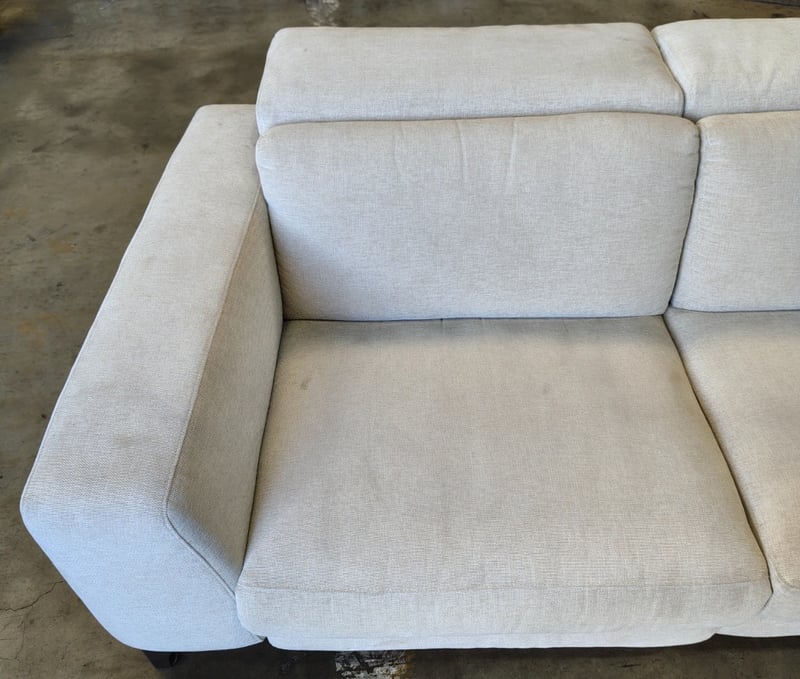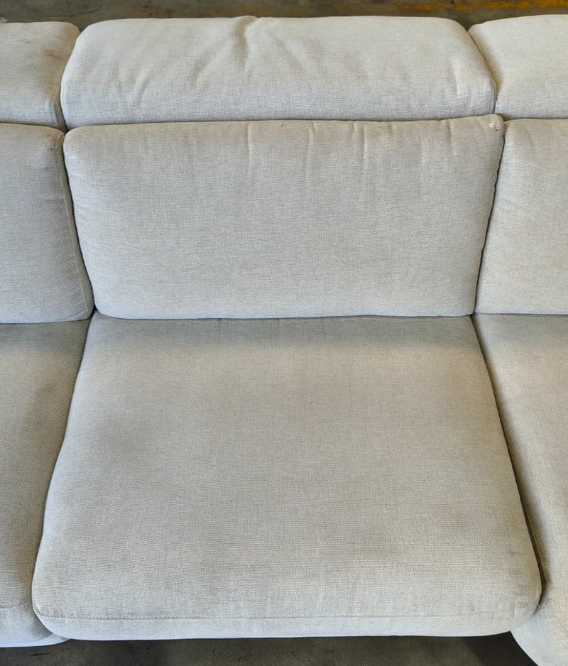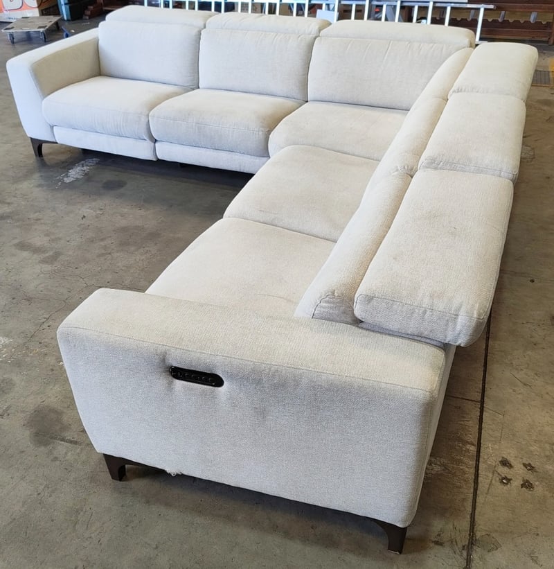 5 seater electric reclining lounge. Light grey/cream fabric dimensions: 285cm x 285cm x 80cm Note: a tear in the fabric, inspection recommended, cleaning required
