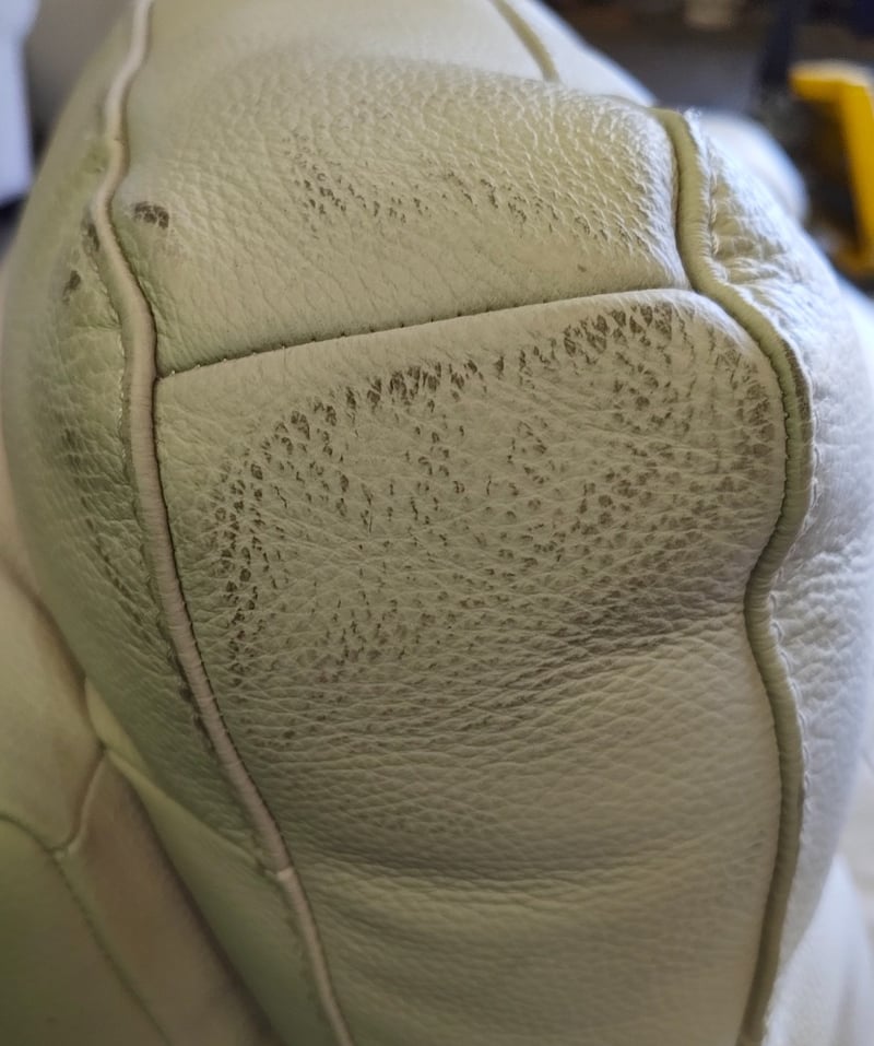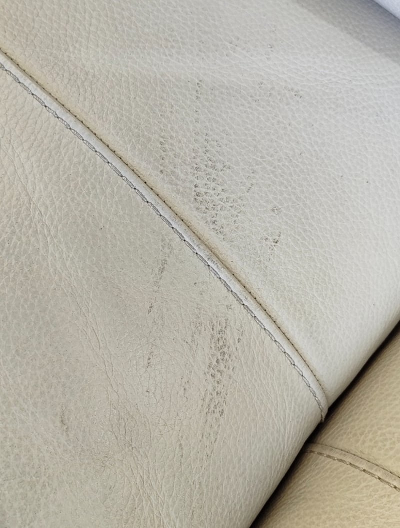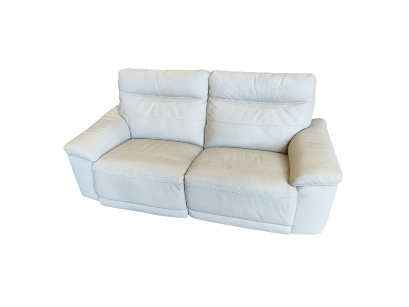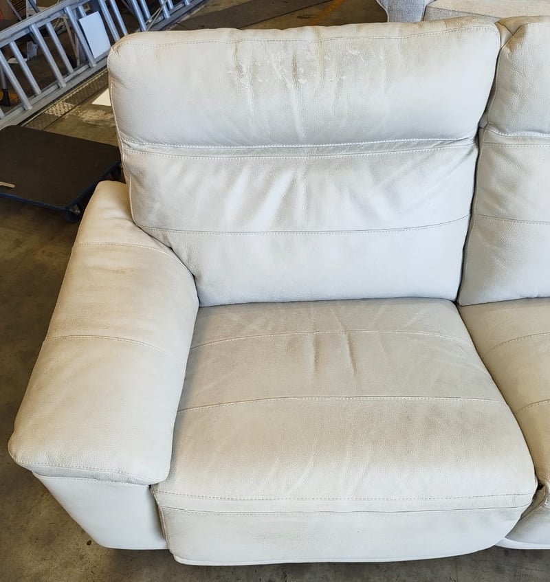 2 seater electric reclining lounge, cream leather.dimensions: 82cm x 200cm x 100cmNote: damage to leather, inspection recommended, cleaning required
