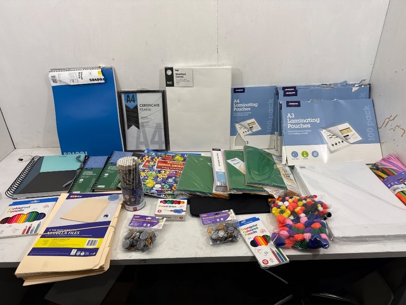 Assorted Office Supplies/ Art Supplies, Brands include J.Burrows, Keji, Studymate, Avery ect. Items include Pencils, Notebooks, Files, Laminating Pouches, Workbooks.